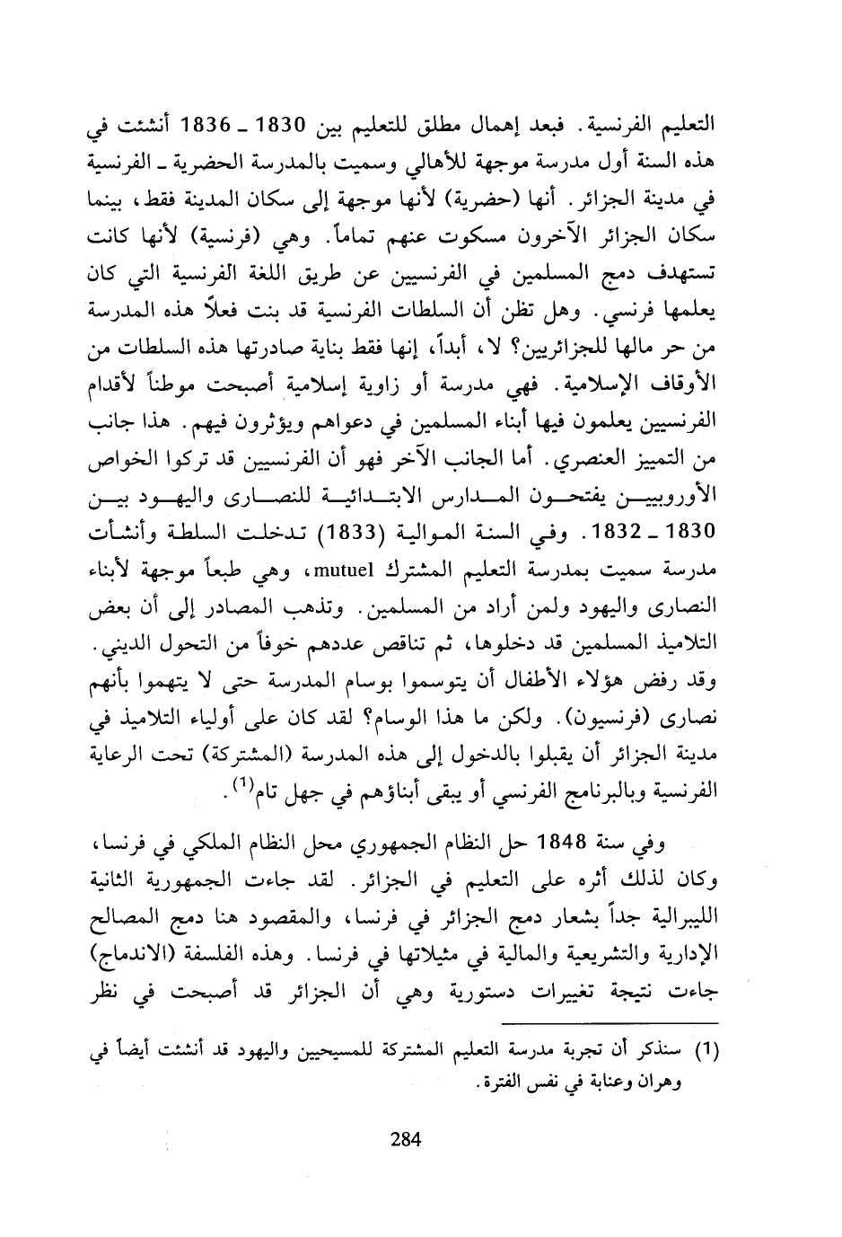 (¬1) سنذكر أن تجربة مدرسة التعليم المشتركة للمسيحيين واليهود قد أنشئت أيضا في وهران وعنابة في نفس الفترة.