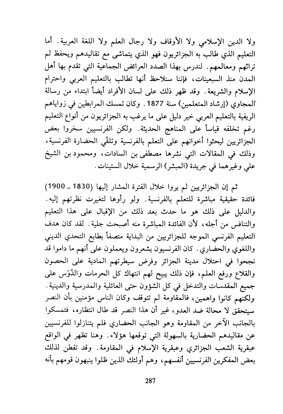ولا الدين الإسلامي ولا الأوقاف ولا رجال العلم ولا اللغة العربية. أما التعليم الذي طالب به الجزائريون فهو الذي يتماشى مع تقاليدهم ويحفظ لهم تراثهم ومعالمهم. لندرس بهذا الصدد العرائض الجماعية التي تقدم بها أهل المدن منذ السبعينات، فإننا سنلاحظ أنها تطالب بالتعليم العربي واحترام الإسلام والشريعة. وقد ظهر ذلك على لسان الأفراد أيضا ابتداء من رسالة المجاوي (إرشاد المتعلمين) سنة 1877. وكان تمسك المرابطين في زواياهم الريفية بالتعليم العربي خير دليل على ما يرغب به الجزائريون من أنواع التعليم رغم تخلفه قياسا على المناهج الحديثة. ولكن الفرنسيين سخروا بعض الجزائريين ليحثوا أخوانهم على التعلم بالفرنسية وتلقي الحضارة الفرنسية، وذلك في المقالات التي نشرها مصطفى بن السادات، ومحمود بن الشيخ علي وغيرهما في جريدة (المبشر) الرسمية خلال الستينات.