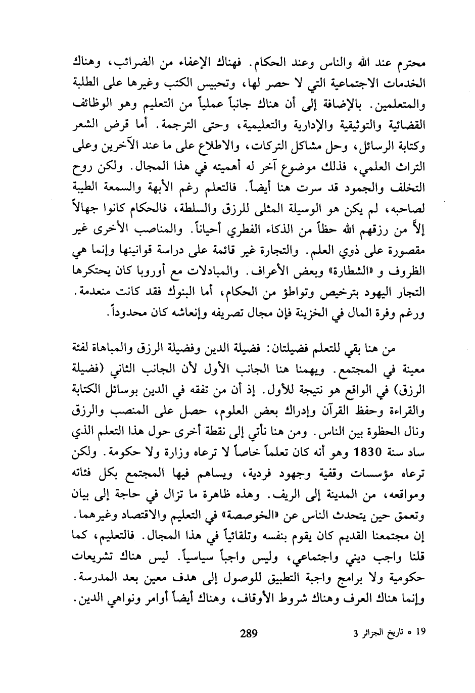 من هنا بقي للتعلم فضيلتان: فضيلة الدين وفضيلة الرزق والمباهاة لفئة معينة في المجتمع. ويهمنا هنا الجانب الأول لأن الجانب الثاني (فضيلة الرزق) في الواقع هو نتيجة للأول. إذ أن من تفقه في الدين بوسائل الكتابة والقراءة وحفظ القرآن وإدراك بعض العلوم، حصل على المنصب والرزق ونال الحظوة بين الناس. ومن هنا نأتي إلى نقطة أخرى حول هذا التعلم الذي ساد سنة 1830 وهو أنه كان تعلما خاصا لا ترعاه وزارة ولا حكومة. ولكن ترعاه مؤسسات وقفية وجهود فردية، ويساهم فيها المجتمع بكل فئاته ومواقعه، من المدينة إلى الريف. وهذه ظاهرة ما تزال في حاجة إلى بيان وتعمق حين يتحدث الناس عن (الخوصصة) في التعليم والاقتصاد وغيرهما. إن مجتمعنا القديم كان يقوم بنفسه وتلقائيا في هذا المجال. فالتعليم، كما قلنا واجب ديني واجتماعي، وليس واجبا سياسيا. ليس هناك تشريعات حكومية ولا برامج واجبة التطبيق للوصول إلى هدف معين بعد المدرسة. وإنما هناك العرف وهناك شروط الأوقاف، وهناك أيضا أوامر ونواهي الدين.