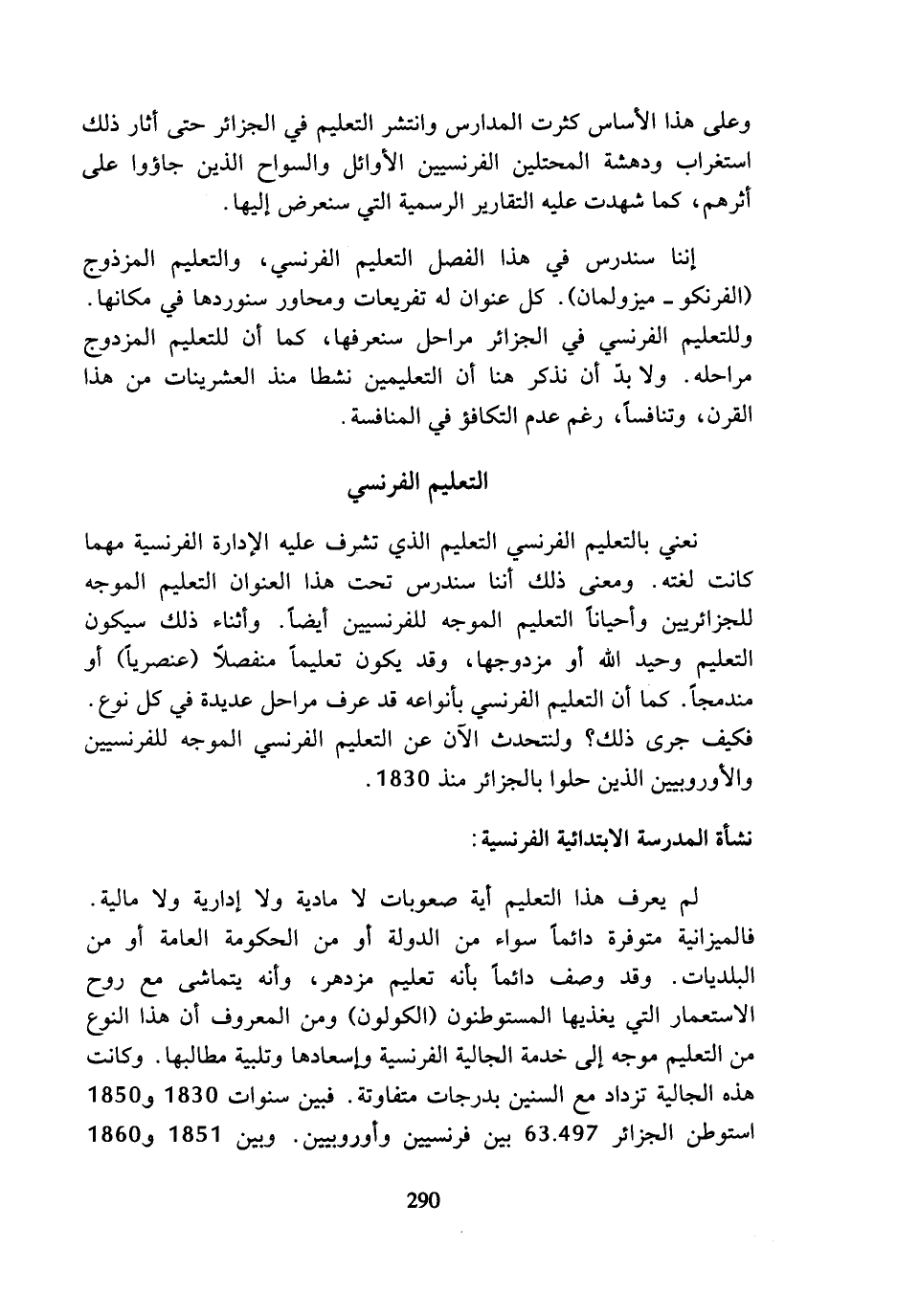 إننا سندرس في هذا الفصل التعليم الفرنسي، والتعليم المزذوج (الفرنكو - ميزولمان). كل عنوان له تفريعات ومحاور سنوردها في مكانها. وللتعليم الفرنسي في الجزائر مراحل سنعرفها، كما أن للتعليم المزدوج مراحله. ولا بد أن نذكر هنا أن التعليمين نشطا منذ العشرينات من هذا القرن، وتنافسا، رغم عدم التكافؤ في المنافسة.
