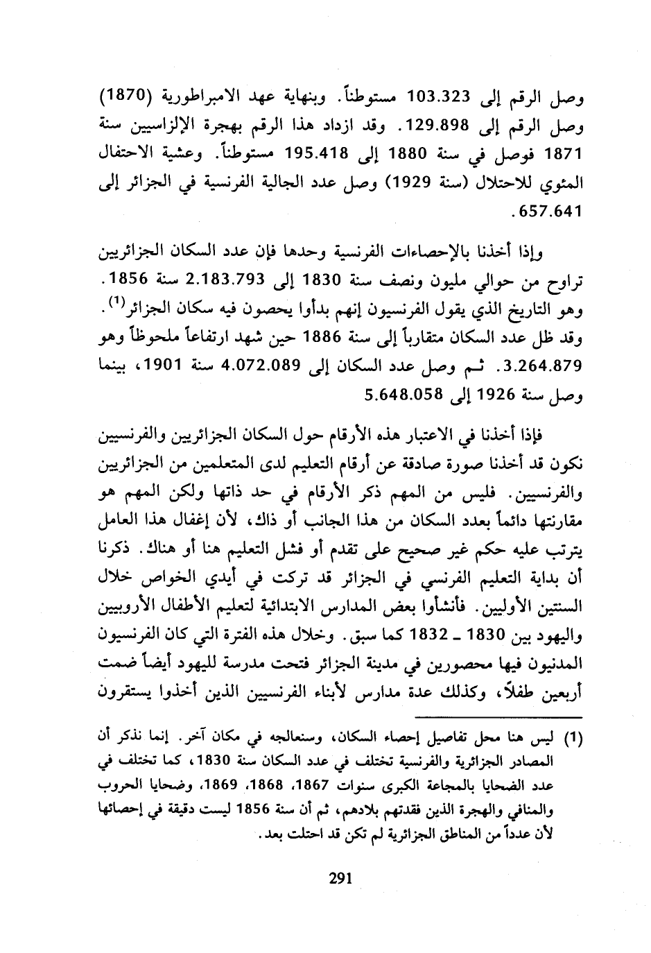(¬1) ليس هنا محل تفاصيل إحصاء السكان، وسنعالجه في مكان آخر. إنما نذكر أن المصادر الجزائرية والفرنسية تختلف في عدد السكان سنة 1830، كما تختلف في عدد الضحايا بالمجاعة الكبرى سنوات 1867، 1868، 1869، وضحايا الحروب والمنافي والهجرة الذين فقدتهم بلادهم، ثم أن سنة 1856 ليست دقيقة في إحصائها لأن عددا من المناطق الجزائرية لم تكن قد احتلت بعد.