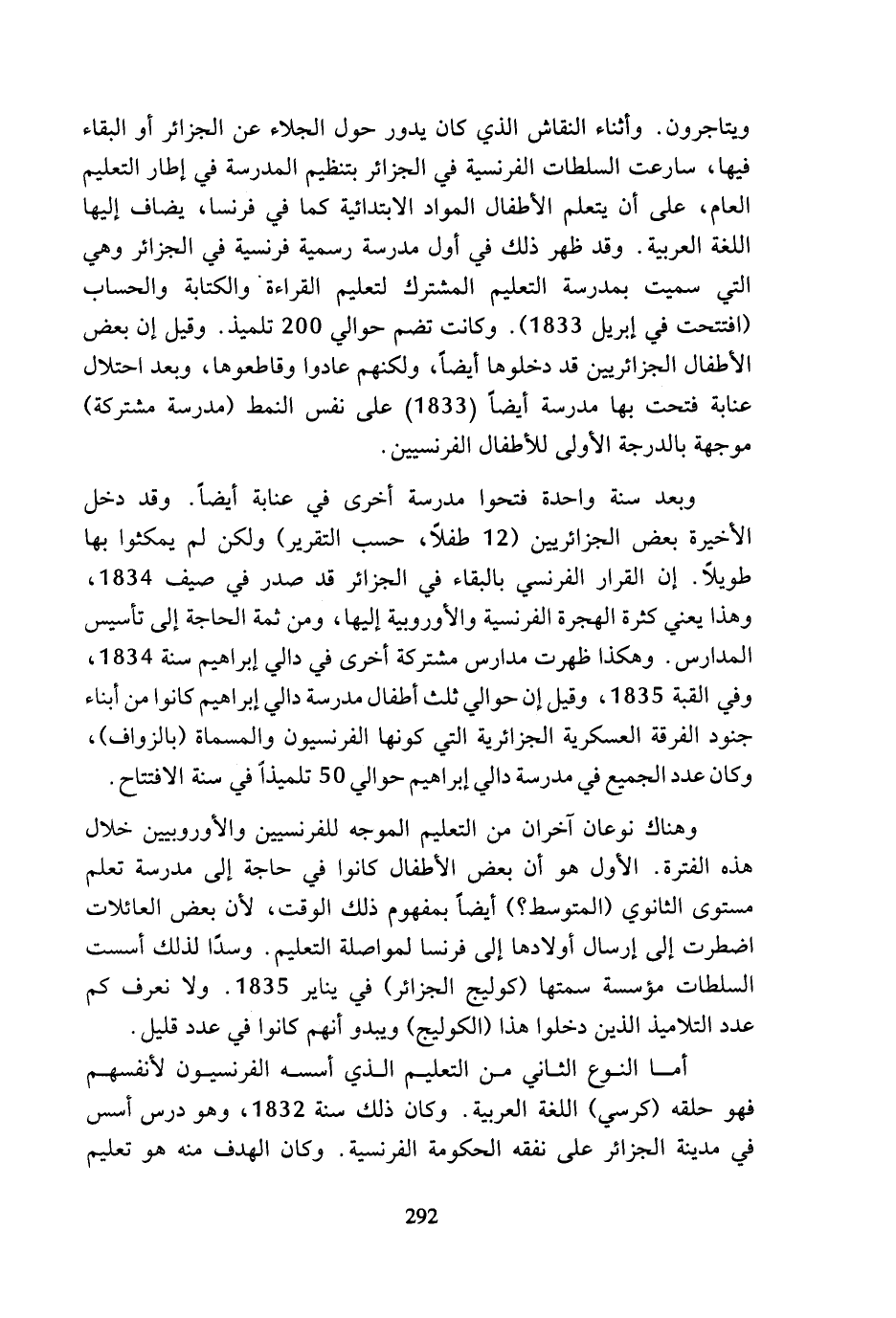 ويتاجرون. وأثناء النقاش الذي كان يدور حول الجلاء عن الجزائر أو البقاء فيها، سارعت السلطات الفرنسية في الجزائر بتنظيم المدرسة في إطار التعليم العام، على أن يتعلم الأطفال المواد الابتدائية كما في فرنسا، يضاف إليها اللغة العربية. وقد ظهر ذلك في أول مدرسة رسمية فرنسية في الجزائر وهي التي سميت بمدرسة التعليم المشترك لتعليم القراءة. والكتابة والحساب (افتتحت في إبريل 1833). وكانت تضم حوالي 200 تلميذ. وقيل إن بعض الأطفال الجزائريين قد دخلوها أيضا، ولكنهم عادوا وقاطعوها، وبعد احتلال عنابة فتحت بها مدرسة أيضا (1833) على نفس النمط (مدرسة مشتركة) موجهة بالدرجة الأولى للأطفال الفرنسيين.