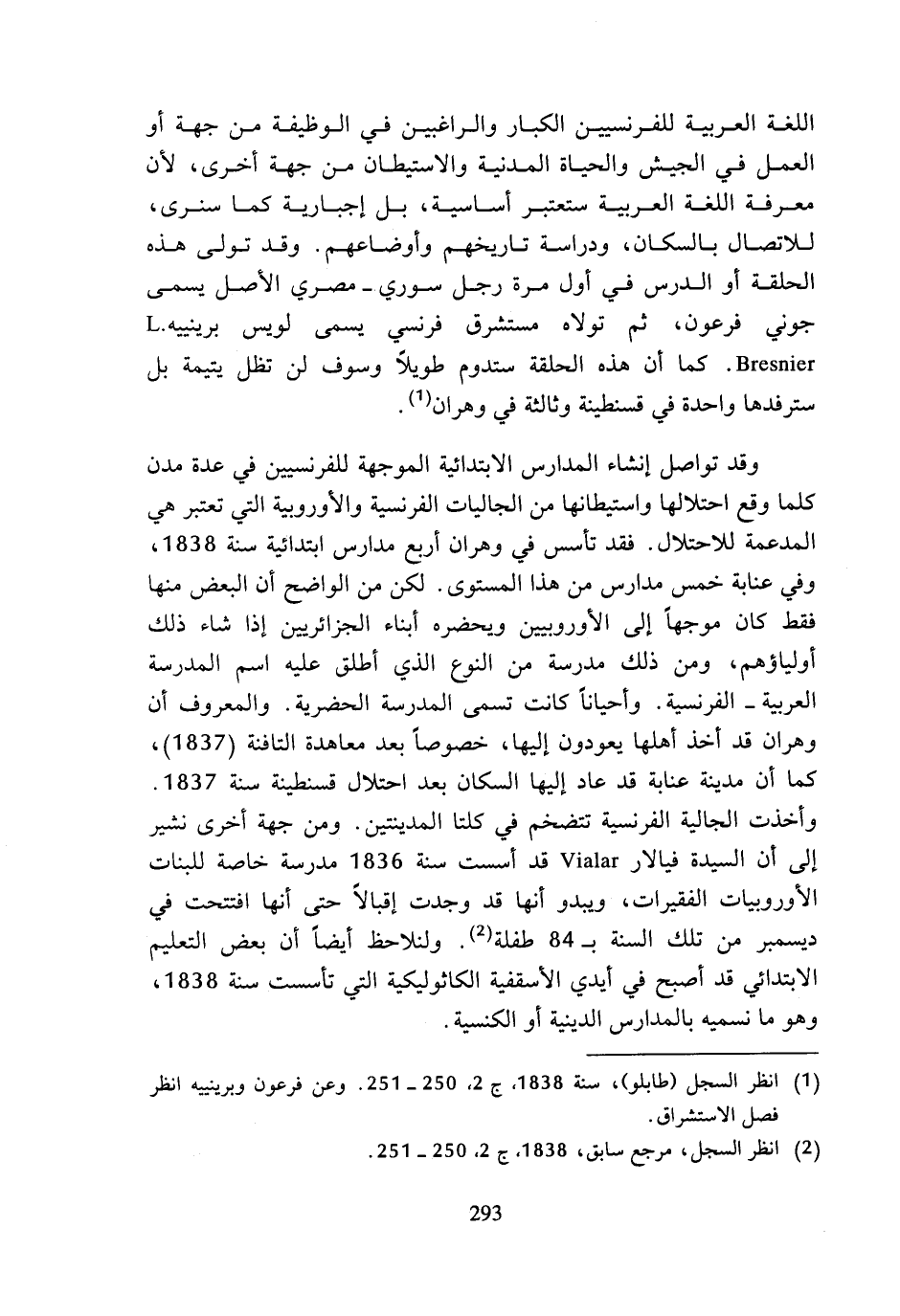 اللغة العربية للفرنسيين الكبار والراغبين في الوظيفة من جهة أو العمل في الجيش والحياة المدنية والاستيطان من جهة أخرى، لأن معرفة اللغة العربية ستعتبر أساسية، بل إجبارية كما سنرى، للاتصال بالسكان، ودراسة تاريخهم وأوضاعهم. وقد تولى هذه الحلقة أو الدرس في أول مرة رجل سوري - مصري الأصل يسمى جوني فرعون، ثم تولاه مستشرق فرنسي يسمى لويس برينييه L.Bresnier. كما أن هذه الحلقة ستدوم طويلا وسوف لن تظل يتيمة بل سترفدها واحدة في قسنطينة وثالثة في وهران (¬1).