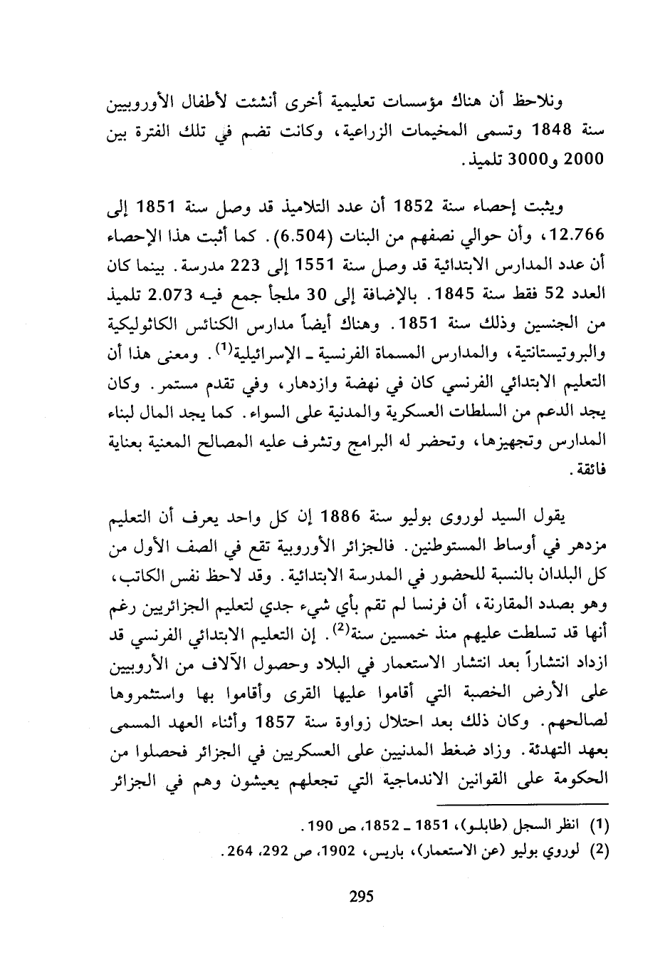 يقول السيد لوروى بوليو سنة 1886 إن كل واحد يعرف أن التعليم مزدهر في أوساط المستوطنين. فالجزائر الأوروبية تقع في الصف الأول من كل البلدان بالنسبة للحضور في المدرسة الابتدائية. وقد لاحظ نفس الكاتب، وهو بصدد المقارنة، أن فرنسا لم تقم بأي شيء جدي لتعليم الجزائريين رغم أنها قد تسلطت عليهم منذ خمسين سنة (¬2). إن التعليم الابتدائي الفرنسي قد ازداد انتشارا بعد انتشار الاستعمار في البلاد وحصول الآلاف من الأروبيين على الأرض الخصبة التي أقاموا عليها القرى وأقاموا بها واستثمروها لصالحهم. وكان ذلك بعد احتلال زواوة سنة 1857 وأثناء العهد المسمى بعهد التهدئة. وزاد ضغط المدنيين على العسكريين في الجزائر فحصلوا من الحكومة على القوانين الاندماجية التي تجعلهم يعيشون وهم في الجزائر