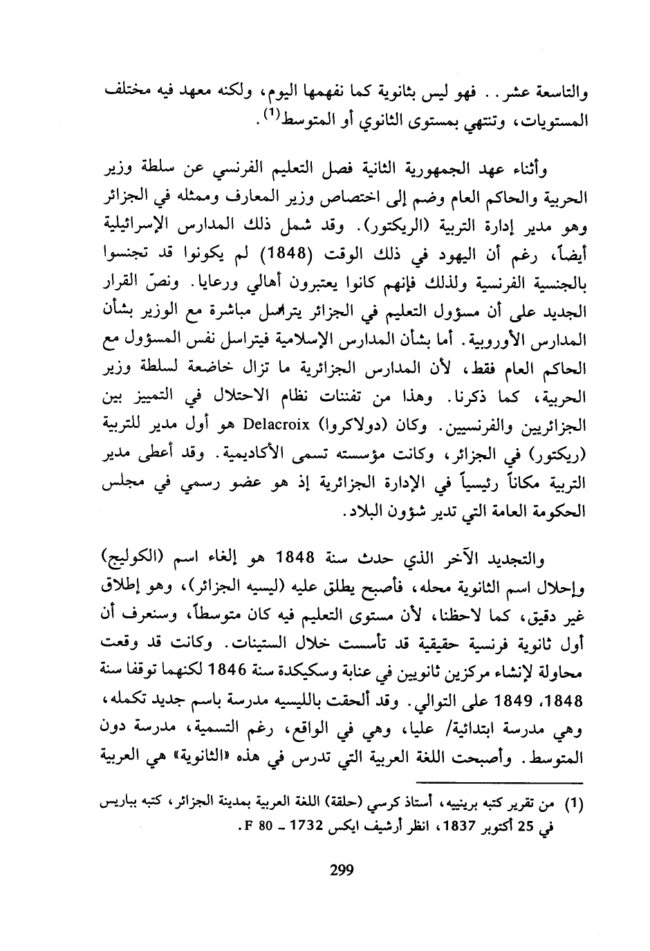 والتجديد الآخر الذي حدث سنة 1848 هو إلغاء اسم (الكوليج) وإحلال اسم الثانوية محله، فأصبح يطلق عليه (ليسيه الجزائر)، وهو إطلاق غير دقيق، كما لاحظنا، لأن مستوى التعليم فيه كان متوسطا، وسنعرف أن أول ثانوية فرنسية حقيقية قد تأسست خلال الستينات. وكانت قد وقعت محاولة لإنشاء مركزين ثانويين في عنابة وسكيكدة سنة 1846 لكنهما توقفا سنة 1848، 1849 على التوالي. وقد ألحقت بالليسيه مدرسة باسم جديد تكمله، وهي مدرسة ابتدائية/ عليا، وهي في الواقع، رغم التسمية، مدرسة دون المتوسط. وأصبحت اللغة العربية التي تدرس في هذه (الثانوية) هي العربية
