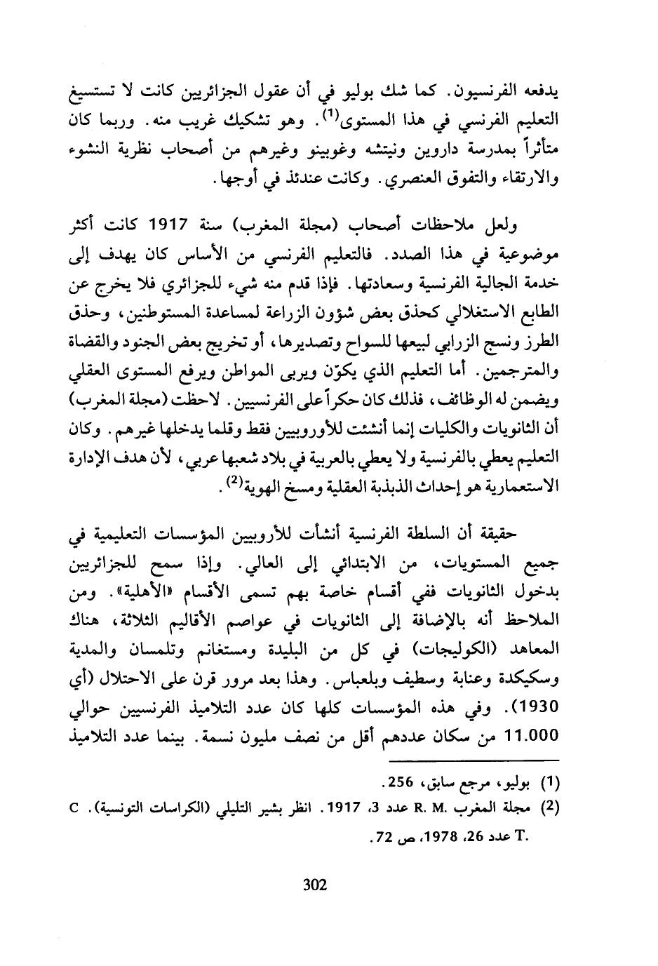يدفعه الفرنسيون. كما شك بوليو في أن عقول الجزائريين كانت لا تستسيغ التعليم الفرنسي في هذا المستوى (¬1). وهو تشكيك غريب منه. وربما كان متأثرا بمدرسة داروين ونيتشه وغوبينو وغيرهم من أصحاب نظرية النشوء والارتقاء والتفوق العنصري. وكانت عندئذ في أوجها.