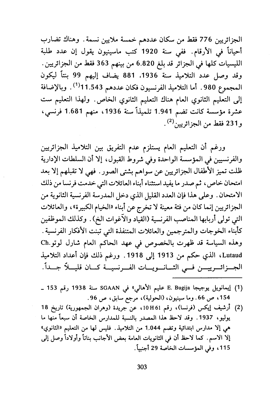 (¬2) أرشيف إيكس (فرنسا)، رقم 61 H 10، عن جريدة (وهران الجمهورية) تاريخ 18 يوليو 1937. وقد لاحظ هذا المصدر بالنسبة للمدارس الخاصة أن سبعا منها ما هي إلا مدارس ابتدائية وتضم 1.044 من التلاميذ. فليس لها من التعليم (الثانوي) إلا الاسم. كما لاحظ أن في الثانويات العامة بعض الأجانب بناتا وأولادا وصل إلى 115، وفي المؤسسات الخاصة 29 أجنبيا.