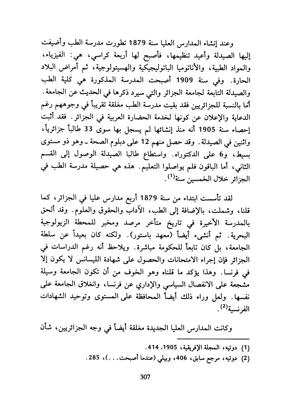 لقد تأسست ابتداء من سنة 1879 أربع مدارس عليا في الجزائر، كما قلنا، وشملت، بالإضافة إلى الطب، الآداب والحقوق والعلوم. وقد ألحق بالمدرسة الأخيرة في تاريخ متأخر مرصد ومخبر للمحطة الزيولوجية البحرية. ثم أنشئ أيضا (معهد باستور). ولكنه كان بعيدا عن سلطة الجامعة، بل كان تابعا للحكومة مباشرة. ويلاحظ أنه رغم الدراسات في الجزائر فإن إجراء الامتحانات والحصول على شهادة الليسانس لا يكون إلا في فرنسا. وهذا يؤكد ما قلناه وهو الخوف من أن تكون الجامعة وسيلة مشجعة على الانفصال السياسي والإداري عن فرنسا، وانغلاق الجامعة على نفسها. ولعل وراء ذلك أيضا المحافظة على المستوى وتوحيد الشهادات الفرنسية (¬2).