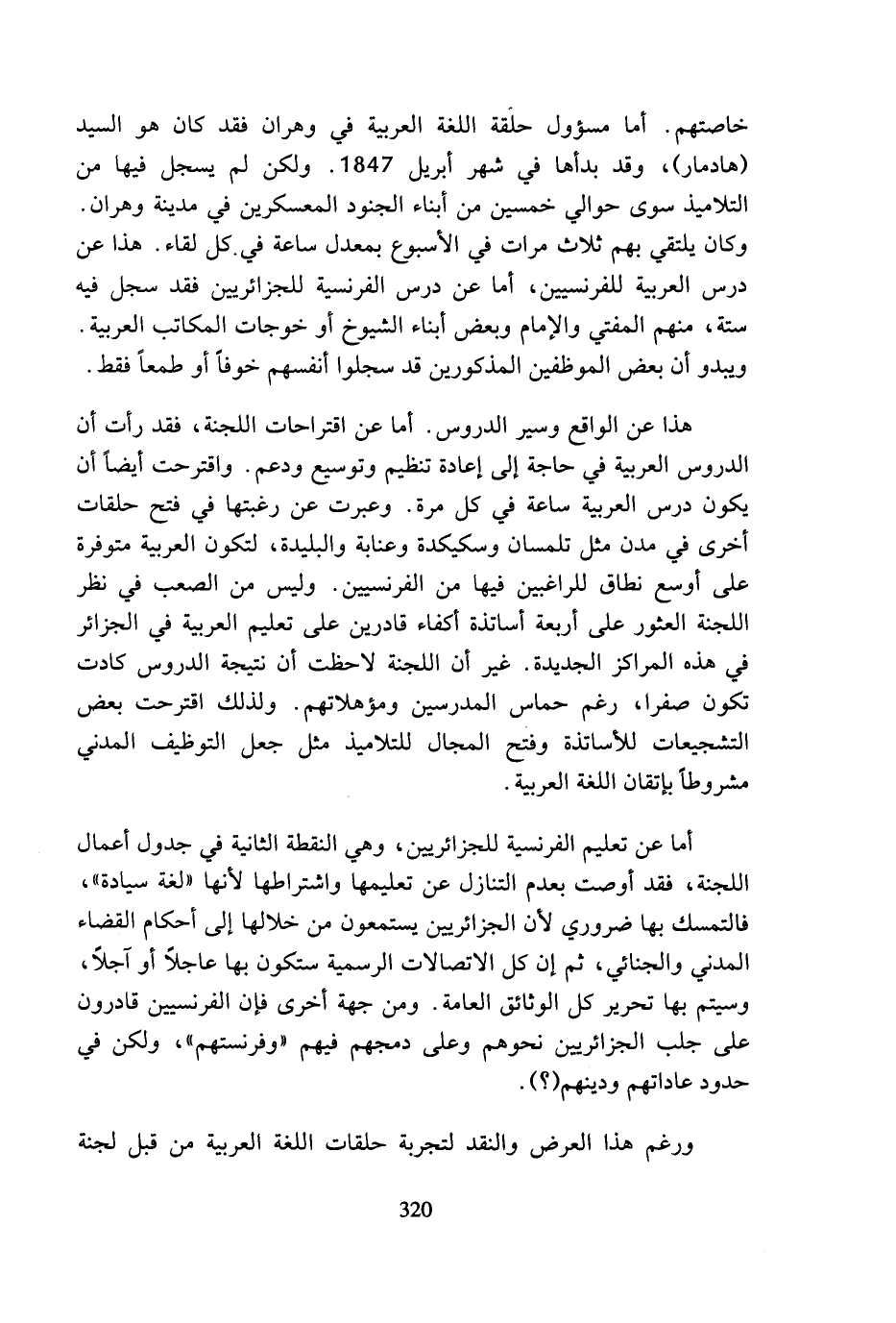خاصتهم. أما مسؤول حلقة اللغة العربية في وهران فقد كان هو السيد (هادمار)، وقد بدأها في شهر أبريل 1847. ولكن لم يسجل فيها من التلاميذ سوى حوالي خمسين من أبناء الجنود المعسكرين في مدينة وهران. وكان يلتقي بهم ثلاث مرات في الأسبوع بمعدل ساعة في كل لقاء. هذا عن درس العربية للفرنسيين، أما عن درس الفرنسية للجزائريين فقد سجل فيه ستة، منهم المفتي والإمام وبعض أبناء الشيوخ أو خوجات المكاتب العربية. ويبدو أن بعض الموظفين المذكورين قد سجلوا أنفسهم خوفا أو طمعا فقط. هذا عن الواقع وسير الدروس. أما عن اقتراحات اللجنة، فقد رأت أن الدروس العربية في حاجة إلى إعادة تنظيم وتوسيع ودعم. واقترحت أيضا أن يكون درس العربية ساعة في كل مرة. وعبرت عن رغبتها في فتح حلقات أخرى في مدن مثل تلمسان وسكيكدة وعنابة والبليدة، لتكون العربية متوفرة على أوسع نطاق للراغبين فيها من الفرنسيين. وليس من الصعب في نظر اللجنة العثور على أربعة أساتذة أكفاء قادرين على تعليم العربية في الجزائر في هذه المراكز الجديدة. غير أن اللجنة لاحظت أن نتيجة الدروس كادت تكون صفرا، رغم حماس المدرسين ومؤهلاتهم. ولذلك اقترحت بعض التشجيعات للأساتذة وفتح المجال للتلاميذ مثل جعل التوظيف المدني مشروطا بإتقان اللغة العربية.