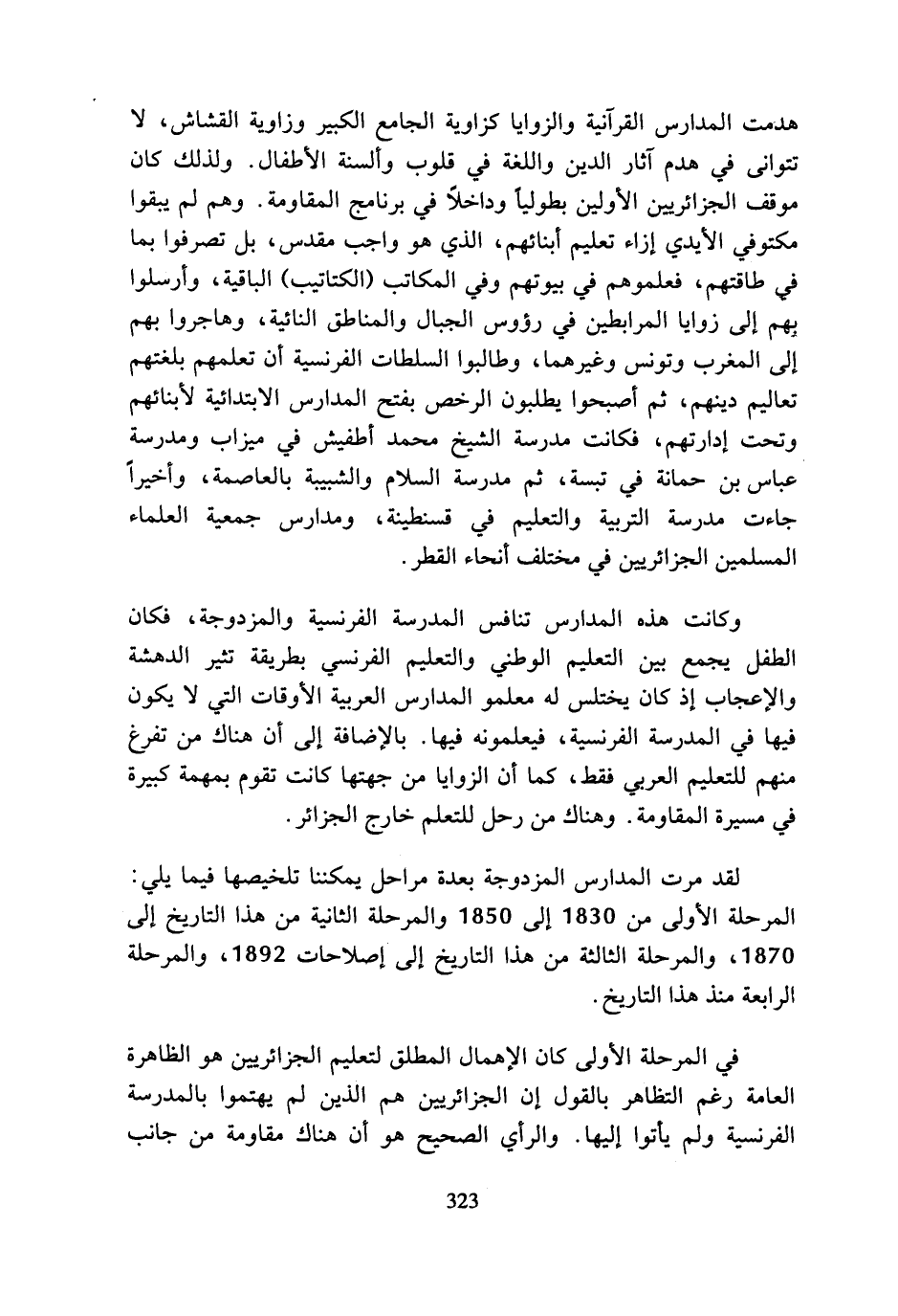 هدمت المدارس القرآنية والزوايا كزاوية الجامع الكبير وزاوية القشاش، لا تتوانى في هدم آثار الدين واللغة في قلوب وألسنة الأطفال. ولذلك كان موقف الجزائريين الأولين بطوليا وداخلا في برنامج المقاومة. وهم لم يبقوا مكتوفي الأيدي إزاء تعليم أبنائهم، الذي هو واجب مقدس، بل تصرفوا بما في طاقتهم، فعلموهم في بيوتهم وفي المكاتب (الكتاتيب) الباقية، وأرسلوا بهم إلى زوايا المرابطين في رؤوس الجبال والمناطق النائية، وهاجروا بهم إلى المغرب وتونس وغيرهما، وطالبوا السلطات الفرنسية أن تعلمهم بلغتهم تعاليم دينهم، ثم أصبحوا يطلبون الرخص بفتح المدارس الابتدائية لأبنائهم وتحت إدارتهم، فكانت مدرسة الشيخ محمد أطفيش في ميزاب ومدرسة عباس بن حمانة في تبسة، ثم مدرسة السلام والشبيبة بالعاصمة، وأخيرا جاءت مدرسة التربية والتعليم في قسنطينة، ومدارس جمعية العلماء المسلمين الجزائريين في مختلف أنحاء القطر.
