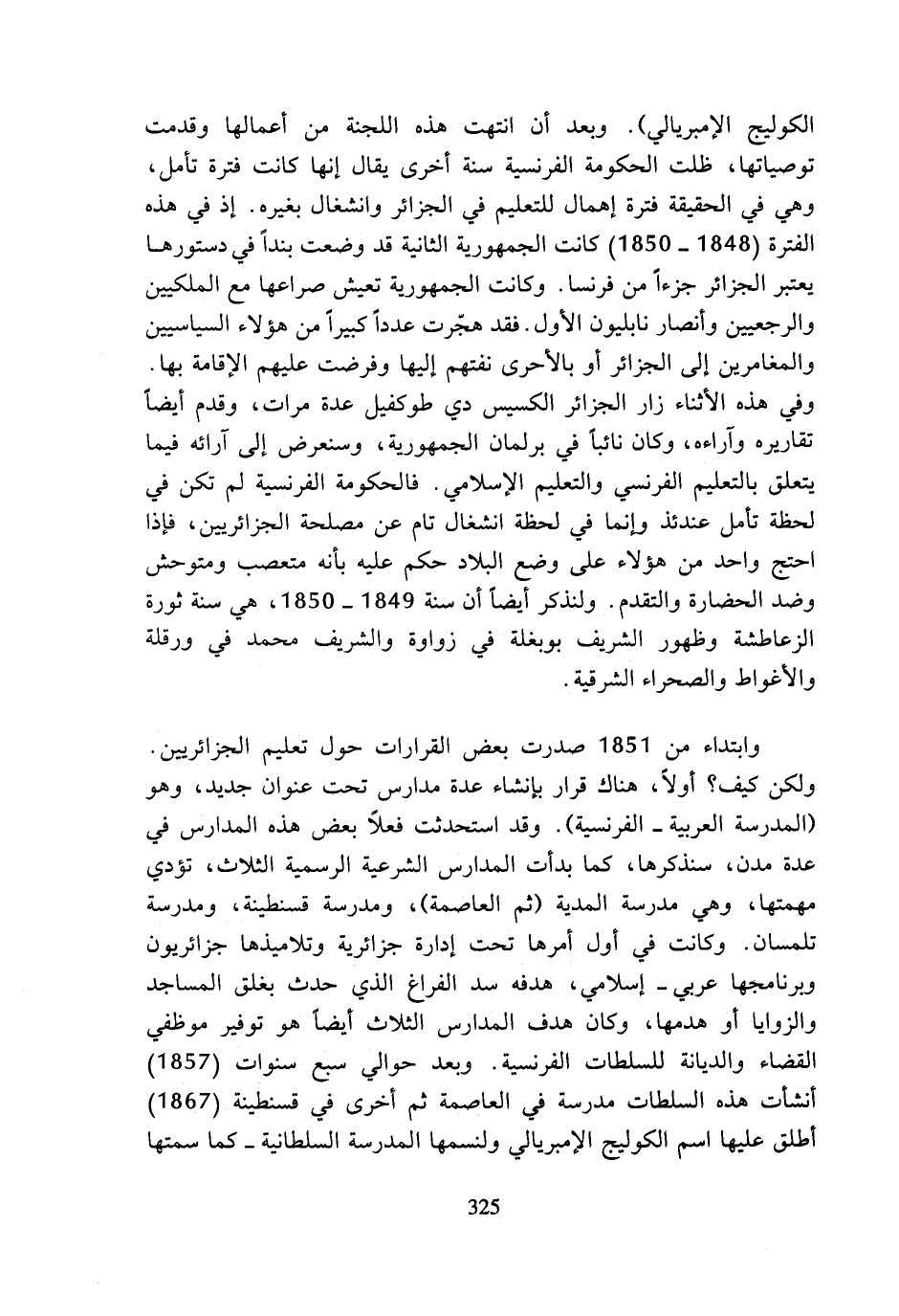 الكوليج الإمبريالي). وبعد أن انتهت هذه اللجنة من أعمالها وقدمت توصياتها، ظلت الحكومة الفرنسية سنة أخرى يقال إنها كانت فترة تأمل، وهي في الحقيقة فترة إهمال للتعليم في الجزائر وانشغال بغيره. إذ في هذه الفترة (1848 - 1850) كانت الجمهورية الثانية قد وضعت بندا في دستورها يعتبر الجزائر جزءا من فرنسا. وكانت الجمهورية تعيش صراعها مع الملكيين والرجعيين وأنصار نابليون الأول. فقد هجرت عددا كبيرا من هؤلاء السياسيين والمغامرين إلى الجزائر أو بالأحرى نفتهم إليها وفرضت عليهم الإقامة بها. وفي هذه الأثناء زار الجزائر الكسيس دي طوكفيل عدة مرات، وقدم أيضا تقاريره وآراءه، وكان نائبا في برلمان الجمهورية، وسنعرض إلى آرائه فيما يتعلق بالتعليم الفرنسي والتعليم الإسلامي. فالحكومة الفرنسية لم تكن في لحظة تأمل عندئذ وإنما في لحظة انشغال تام عن مصلحة الجزائريين، فإذا احتج واحد من هؤلاء على وضع البلاد حكم عليه بأنه متعصب ومتوحش وضد الحضارة والتقدم. ولنذكر أيضا أن سنة 1849 - 1850، هي سنة ثورة الزعاطشة وظهور الشريف بوبغلة في زواوة والشريف محمد في ورقلة والأغواط والصحراء الشرقية.