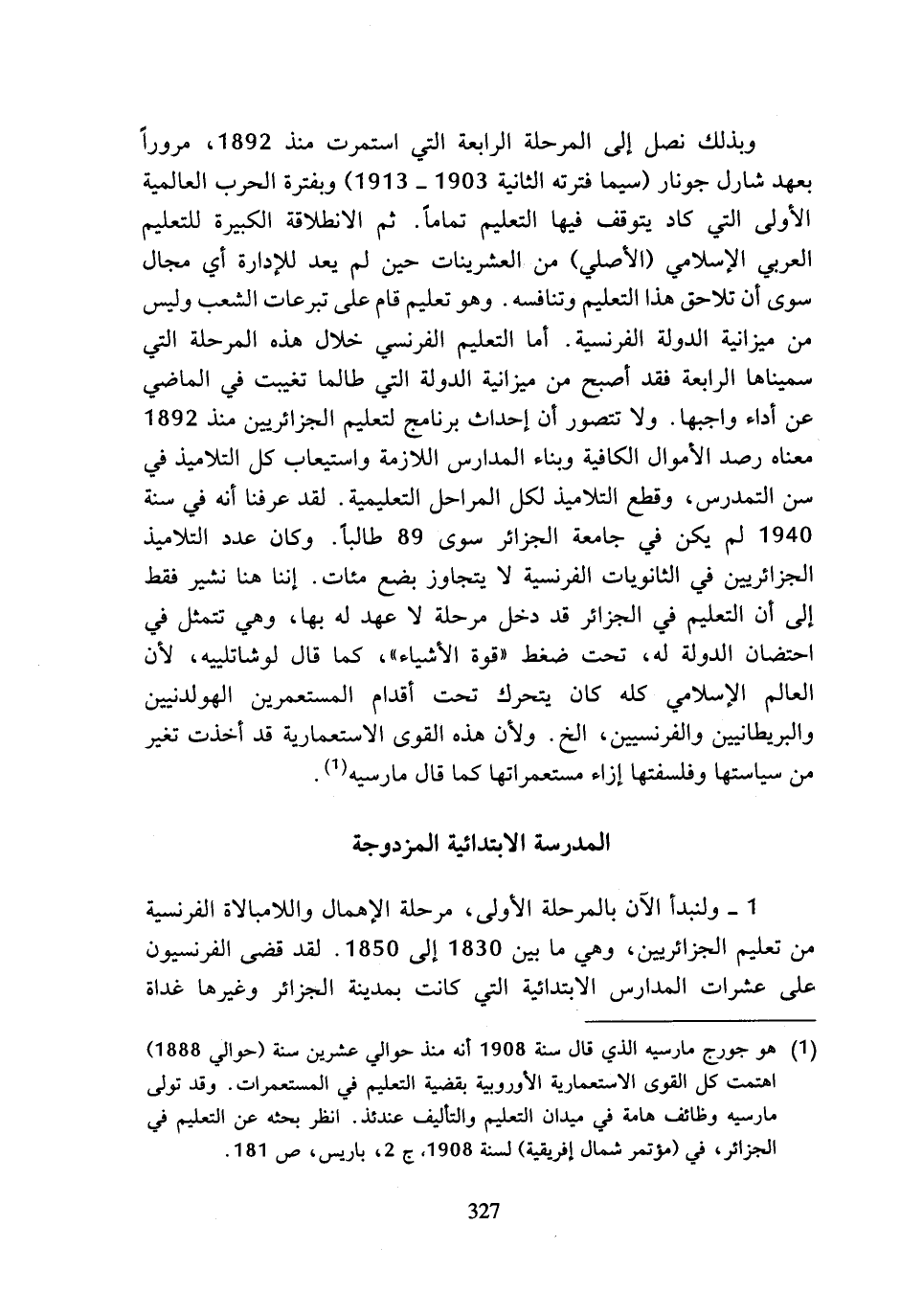 (¬1) هو جورج مارسيه الذي قال سنة 1908 أنه منذ حوالي عشرين سنة (حوالي 1888) اهتمت كل القوى الاستعمارية الأوروبية بقضية التعليم في المستعمرات. وقد تولى مارسيه وظائف هامة في ميدان التعليم والتأليف عندئذ. انظر بحثه عن التعليم في الجزائر، في (مؤتمر شمال إفريقية) لسنة 1908، ج 2، باريس، ص 181.