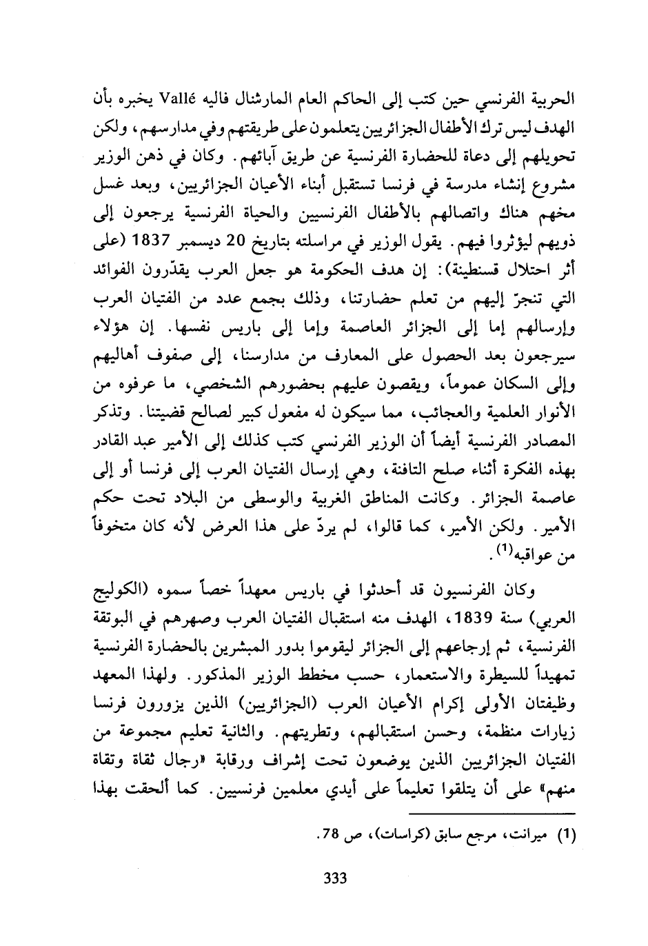 الحربية الفرنسي حين كتب إلى الحاكم العام المارشال فاليه Vallé يخبره بأن الهدف ليس ترك الأطفال الجزائريين يتعلمون على طريقتهم وفي مدارسهم، ولكن تحويلهم إلى دعاة للحضارة الفرنسية عن طريق آبائهم. وكان في ذهن الوزير مشروع إنشاء مدرسة في فرنسا تستقبل أبناء الأعيان الجزائريين، وبعد غسل مخهم هناك واتصالهم بالأطفال الفرنسيين والحياة الفرنسية يرجعون إلى ذويهم ليؤثروا فيهم. يقول الوزير في مراسلته بتاريخ 20 ديسمبر 1837 (على أثر احتلال قسنطينة): إن هدف الحكومة هو جعل العرب يقدرون الفوائد التي تنجر إليهم من تعلم حضارتنا، وذلك بجمع عدد من الفتيان العرب وإرسالهم إما إلى الجزائر العاصمة وإما إلى باريس نفسها. إن هؤلاء سيرجعون بعد الحصول على المعارف من مدارسنا، إلى صفوف أهاليهم وإلى السكان عموما، ويقصون عليهم بحضورهم الشخصي، ما عرفوه من الأنوار العلمية والعجائب، مما سيكون له مفعول كبير لصالح قضيتنا. وتذكر المصادر الفرنسية أيضا أن الوزير الفرنسي كتب كذلك إلى الأمير عبد القادر بهذه الفكرة أثناء صلح التافنة، وهي إرسال الفتيان العرب إلى فرنسا أو إلى عاصمة الجزائر. وكانت المناطق الغربية والوسطى من البلاد تحت حكم الأمير. ولكن الأمير، كما قالوا، لم يرد على هذا العرض لأنه كان متخوفا من عواقبه (¬1).