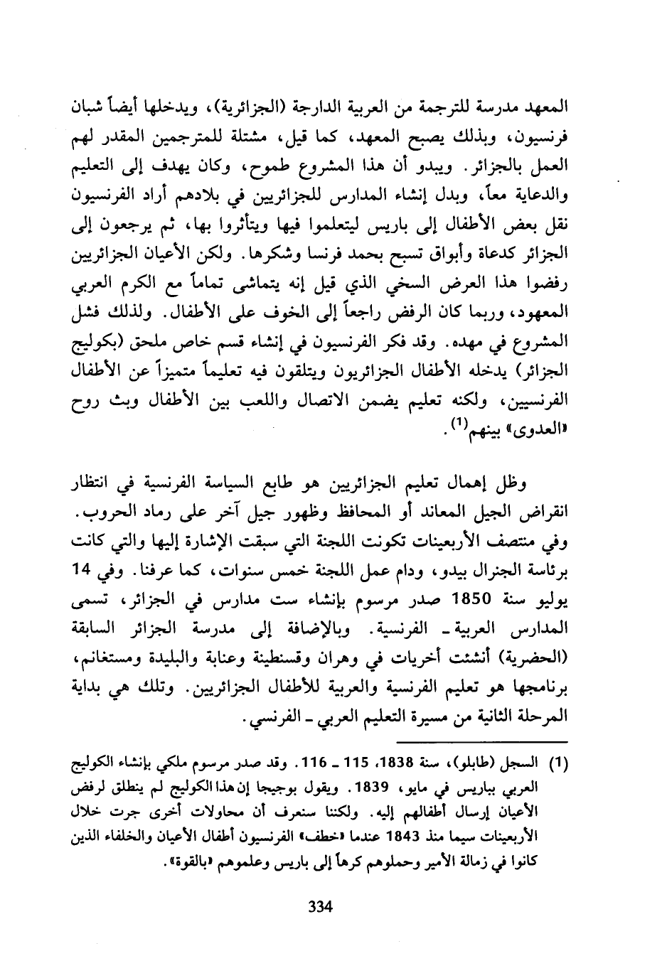 (¬1) السجل (طابلو)، سنة 1838، 115 - 116. وقد صدر مرسوم ملكي بإنشاء الكوليج العربي بباريس في مايو، 1839. ويقول بوجيجا إن هذا الكوليج لم ينطلق لرفض الأعيان إرسال أطفالهم إليه. ولكننا سنعرف أن محاولات أخرى جرت خلال الأربعينات سيما منذ 1843 عندما (خطف) الفرنسيون أطفال الأعيان والخلفاء الذين كانوا في زمالة الأمير وحملوهم كرها إلى باريس وعلموهم (بالقوة).