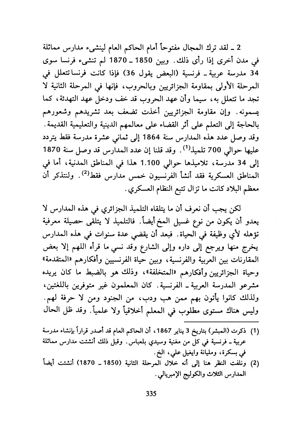 2 - لقد ترك المجال مفتوحا أمام الحاكم العام لينشئ مدارس مماثلة في مدن أخرى إذا رأى ذلك. وبين 1850 - 1870 لم تنشئ فرنسا سوى 34 مدرسة عربية - فرنسية (البعض يقول 36) فإذا كانت فرنسا تتعلل في المرحلة الأولى بمقاومة الجزائريين وبالحروب، فإنها في المرحلة الثانية لا تجد ما تتعلل به، سيما وأن عهد الحروب قد خف ودخل عهد التهدئة، كما يسمونه. وإن مقاومة الجزائريين أخذت تضعف بعد تشريدهم وشعورهم بالحاجة إلى التعلم على أثر القضاء على معالمهم الدينية والتعليمية القديمة. وقد وصل عدد هذه المدارس سنة 1864 إلى ثماني عشرة مدرسة فقط يتردد عليها حوالي 700 تلميذ (¬1). وقد قلنا إن عدد المدارس قد وصل سنة 1870 إلى 34 مدرسة، تلاميذها حوالي 1، 155 هذا في المناطق المدنية، أما في المناطق العسكرية فقد أنشأ الفرنسيون خمس مدارس فقط (¬2). ولنتذكر أن معظم البلاد كانت ما تزال تتبع النظام العسكري.