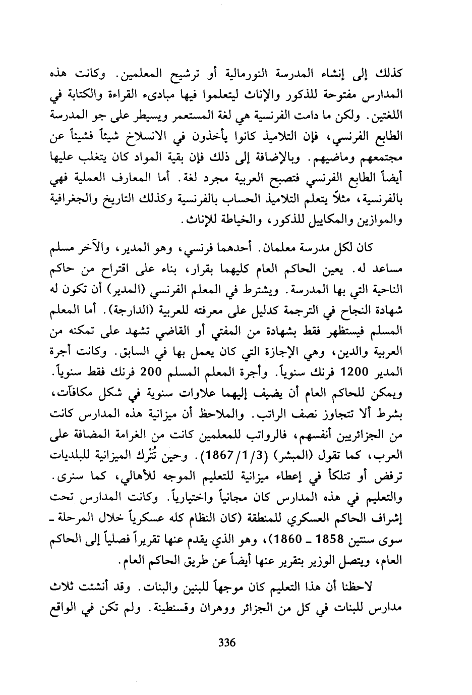 كذلك إلى إنشاء المدرسة النورمالية أو ترشيح المعلمين. وكانت هذه المدارس مفتوحة للذكور والإناث ليتعلموا فيها مبادئ القراءة والكتابة في اللغتين. ولكن ما دامت الفرنسية هي لغة المستعمر ويسيطر على جو المدرسة الطابع الفرنسي، فإن التلاميذ كانوا يأخذون في الانسلاخ شيئا فشيئا عن مجتمعهم وماضيهم. وبالإضافة إلى ذلك فإن بقية المواد كان يتغلب عليها أيضا الطابع الفرنسي فتصبح العربية مجرد لغة. أما المعارف العملية فهي بالفرنسية، مثلا يتعلم التلاميذ الحساب بالفرنسية وكذلك التاريخ والجغرافية والموازين والمكاييل للذكور، والخياطة للإناث.