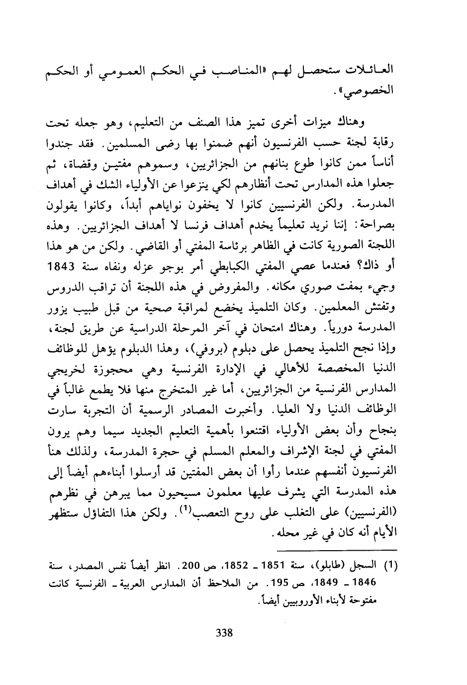 وهناك ميزات أخرى تميز هذا الصنف من التعليم، وهو جعله تحت رقابة لجنة حسب الفرنسيون أنهم ضمنوا بها رضى المسلمين. فقد جندوا أناسا ممن كانوا طوع بنانهم من الجزائريين، وسموهم مفتين وقضاة، ثم جعلوا هذه المدارس تحت أنظارهم لكي ينزعوا عن الأولياء الشك في أهداف المدرسة. ولكن الفرنسيين كانوا لا يخفون نواياهم أبدا، وكانوا يقولون بصراحة: إننا نريد تعليما يخدم أهداف فرنسا لا أهداف الجزائريين. وهذه اللجنة الصورية كانت في الظاهر برئاسة المفتي أو القاضي. ولكن من هو هذا أو ذاك؟ فعندما عصي المفتي الكبابطي أمر بوجو عزله ونفاه سنة 1843 وجيء بمفت صوري مكانه. والمفروض في هذه اللجنة أن تراقب الدروس وتفتش المعلمين. وكان التلميذ يخضع لمراقبة صحية من قبل طبيب يزور المدرسة دوريا. وهناك امتحان في آخر المرحلة الدراسية عن طريق لجنة، وإذا نجح التلميذ يحصل على دبلوم (بروفي)، وهذا الدبلوم يؤهل للوظائف الدنيا المخصصة للأهالي في الإدارة الفرنسية وهي محجوزة لخريجي المدارس الفرنسية من الجزائريين، أما غير المتخرج منها فلا يطمع غالبا في الوظائف الدنيا ولا العليا. وأخبرت المصادر الرسمية أن التجربة سارت بنجاح وأن بعض الأولياء اقتنعوا بأهمية التعليم الجديد سيما وهم يرون المفتي في لجنة الإشراف والمعلم المسلم في حجرة المدرسة، ولذلك هنأ الفرنسيون أنفسهم عندما رأوا أن بعض المفتين قد أرسلوا أبناءهم أيضا إلى هذه المدرسة التي يشرف عليها معلمون مسيحيون مما يبرهن في نظرهم (الفرنسيين) على التغلب على روح التعصب (¬1). ولكن هذا التفاؤل ستظهر الأيام أنه كان في غير محله.