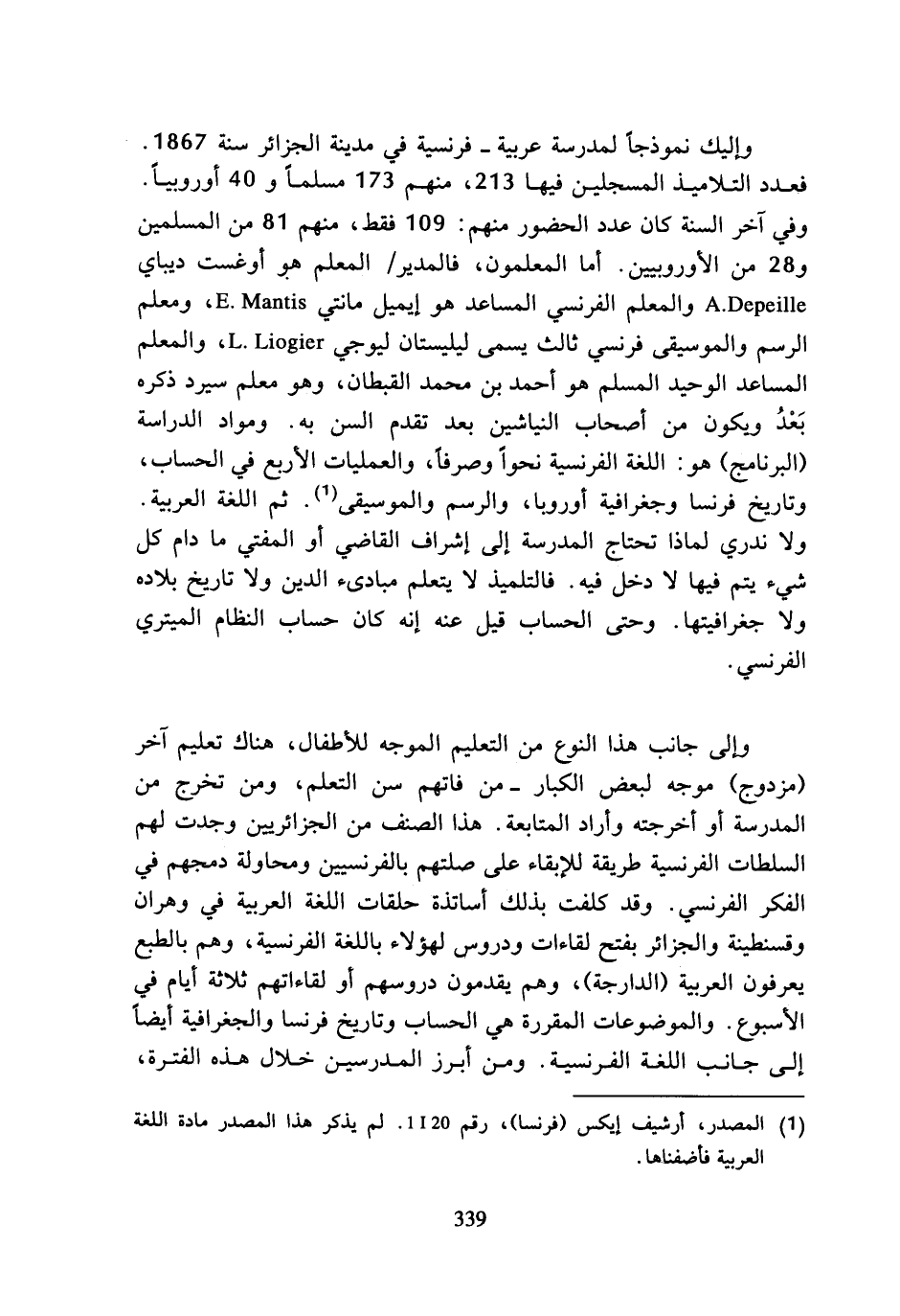 فعدد التلاميذ المسجلين فيها 213، منهم 173 مسلما و 40 أوروبيا. وفي آخر السنة كان عدد الحضور منهم: 159 فقط، منهم 81 من المسلمين و 28 من الأوروبيين. أما المعلمون، فالمدير/ المعلم هو أوغست ديباي A.Depeile والمعلم الفرنسي المساعد هو إيميل مانتي E.Mantis، ومعلم الرسم والموسيقى فرنسي ثالث يسمى ليليستان ليوجي L.Liogier، والمعلم المساعد الوحيد المسلم هو أحمد بن محمد القبطان، وهو معلم سيرد ذكره بعد ويكون من أصحاب النياشين بعد تقدم السن به. ومواد الدراسة (البرنامج) هو: اللغة الفرنسية نحوا وصرفا، والعمليات الأربع في الحساب، وتاريخ فرنسا وجغرافية أوروبا، والرسم والموسيقى (¬1). ثم اللغة العربية. ولا ندري لماذا تحتاج المدرسة إلى إشراف القاضي أو المفتي ما دام كل شيء يتم فيها لا دخل فيه. فالتلميذ لا يتعلم مبادئ الدين ولا تاريخ بلاده ولا جغرافيتها. وحتى الحساب قيل عنه إنه كان حساب النظام الميتري الفرنسي.