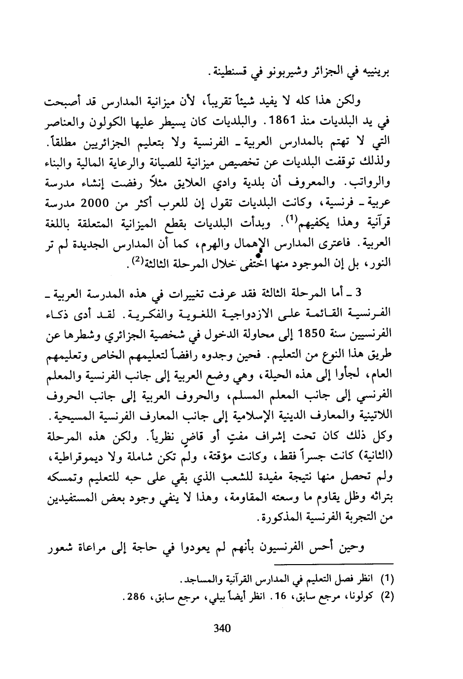 3 - أما المرحلة الثالثة فقد عرفت تغييرات في هذه المدرسة العربية - الفرنسية القائمة على الازدواجية اللغوية والفكرية. لقد أدى ذكاء الفرنسيين سنة 1850 إلى محاولة الدخول في شخصية الجزائري وشطرها عن طريق هذا النوع من التعليم. فحين وجدوه رافضا لتعليمهم الخاص وتعليمهم العام، لجأوا إلى هذه الحيلة، وهي وضع العربية إلى جانب الفرنسية والمعلم الفرنسي إلى جانب المعلم المسلم، والحروف العربية إلى جانب الحروف اللاتينية والمعارف الدينية الإسلامية إلى جانب المعارف الفرنسية المسيحية. وكل ذلك كان تحت إشراف مفت أو قاض نظريا. ولكن هذه المرحلة (الثانية) كانت جسرا فقط، وكانت مؤقتة، ولم تكن شاملة ولا ديموقراطية، ولم تحصل منها نتيجة مفيدة للشعب الذي بقي على حبه للتعليم وتمسكه بتراثه وظل يقاوم ما وسعته المقاومة، وهذا لا ينفي وجود بعض المستفيدين من التجربة الفرنسية المذكورة.