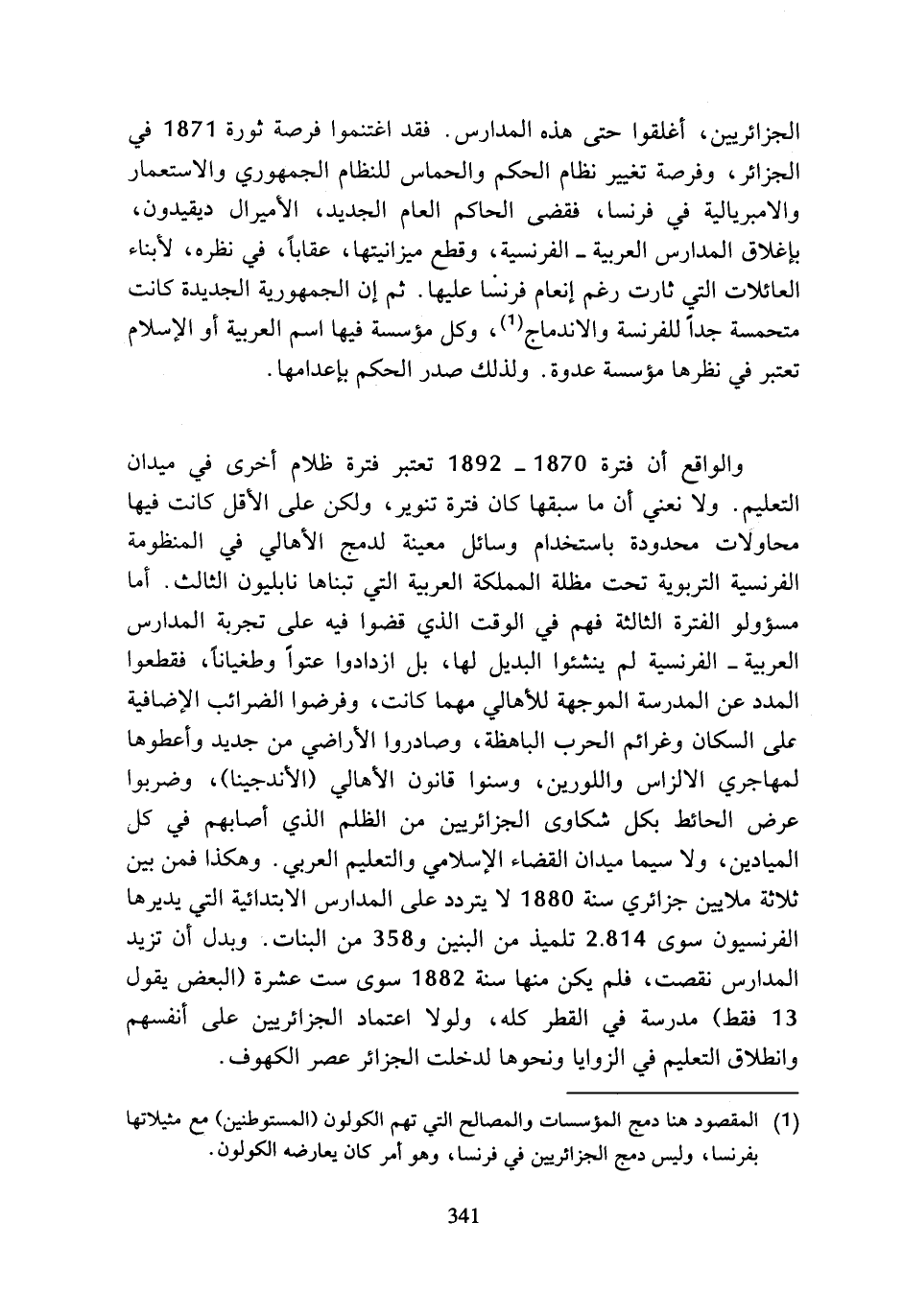 الجزائريين، أغلقوا حتى هذه المدارس. فقد اغتنموا فرصة ثورة 1871 في الجزائر، وفرصة تغيير نظام الحكم والحماس للنظام الجمهوري والاستعمار والامبريالية في فرنسا، فقضى الحاكم العام الجديد، الأميرال ديقيدون، لإغلاق المدارس العربية - الفرنسية، وقطع ميزانيتها، عقابا، في نظره، لأبناء العائلات التي ثارت رغم إنعام فرنسا عليها. ثم إن الجمهورية الجديدة كانت متحمسة جدا للفرنسة والاندماج (¬1)، وكل مؤسسة فيها اسم العربية أو الإسلام تعتبر في نظرها مؤسسة عدوة. ولذلك صدر الحكم بإعدامها.
