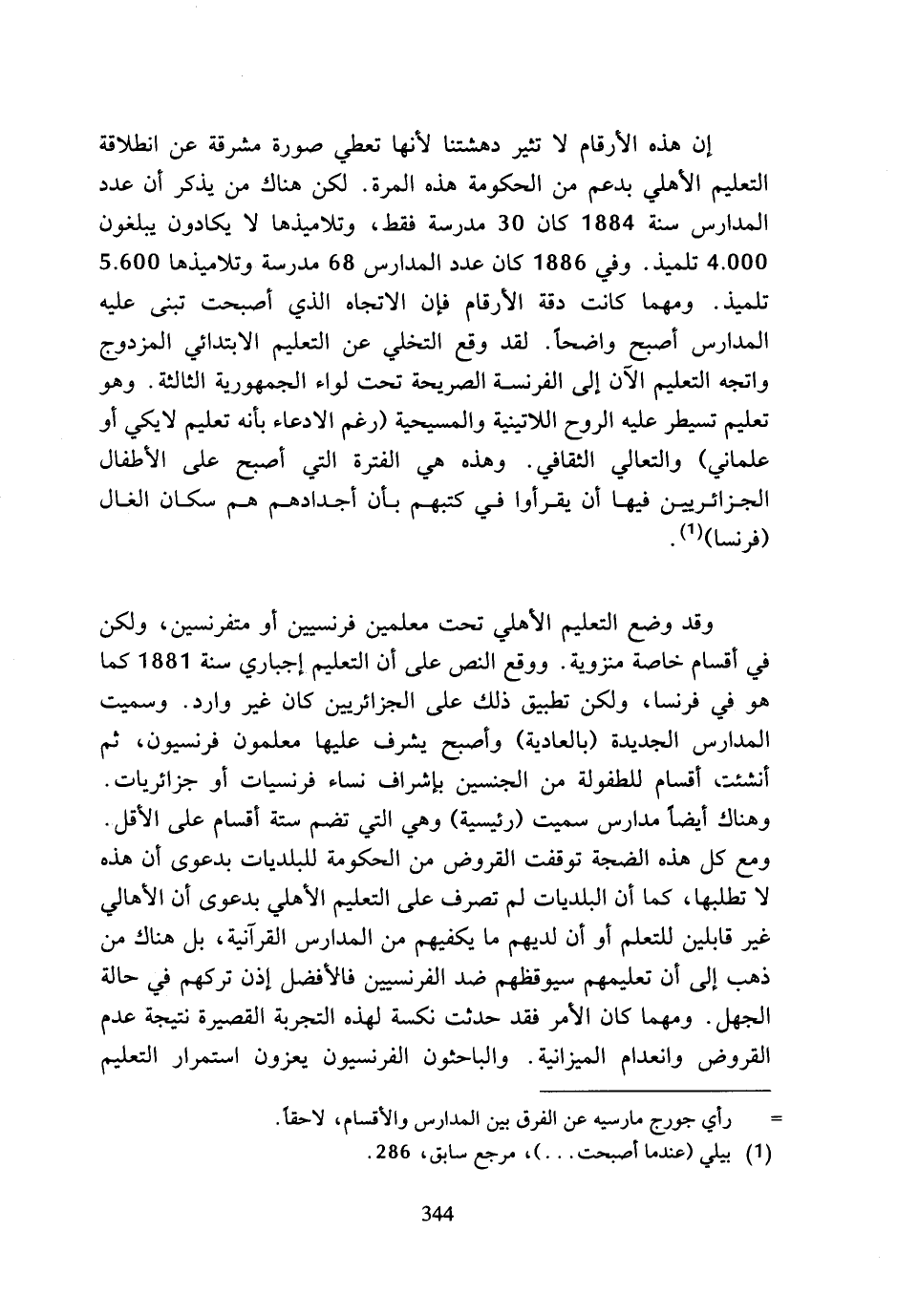 إن هذه الأرقام لا تثير دهشتنا لأنها تعطي صورة مشرقة عن انطلاقة التعليم الأهلي بدعم من الحكومة هذه المرة. لكن هناك من يذكر أن عدد المدارس سنة 1884 كان 30 مدرسة فقط، وتلاميذها لا يكادون يبلغون 4.000 تلميذ. وفي 1886 كان عدد المدارس 68 مدرسة وتلاميذها 5.600 تلميذ. ومهما كانت دقة الأرقام فإن الاتجاه الذي أصبحت تبنى عليه المدارس أصبح واضحا. لقد وقع التخلي عن التعليم الابتدائي المزدوج واتجه التعليم الآن إلى الفرنسة الصريحة تحت لواء الجمهورية الثالثة. وهو تعليم تسيطر عليه الروح اللاتينية والمسيحية (رغم الادعاء بأنه تعليم لايكي أو علماني) والتعالي الثقافي. وهذه هي الفترة التي أصبح على الأطفال الجزائريين فيها أن يقرأوا في كتبهم بأن أجدادهم هم سكان الغال (فرنسا) (¬1).