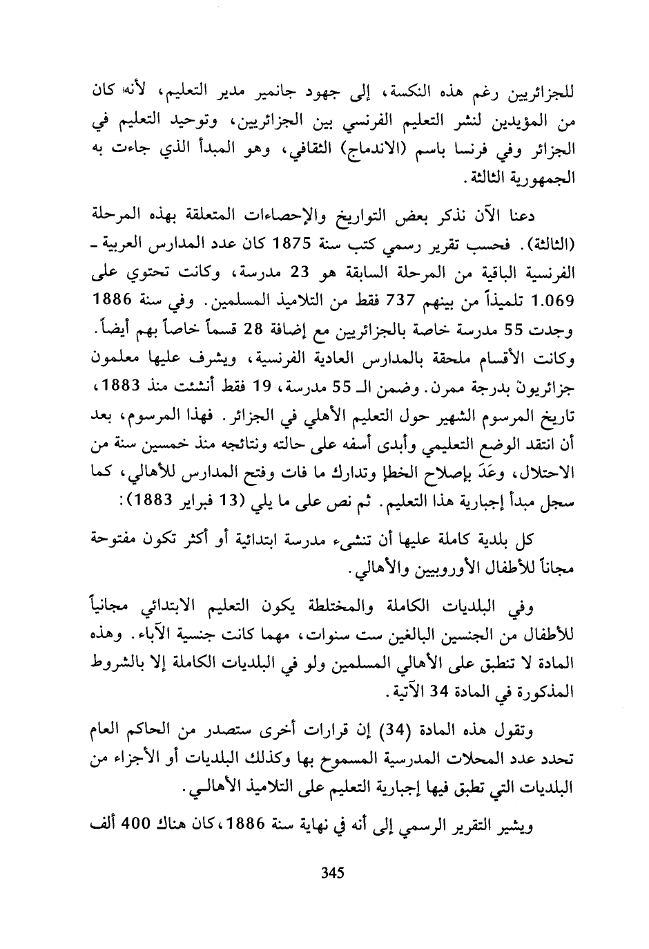 دعنا الآن نذكر بعض التواريخ والإحصاءات المتعلقة بهذه المرحلة (الثالثة). فحسب تقرير رسمي كتب سنة 1875 كان عدد المدارس العربية - الفرنسية الباقية من المرحلة السابقة هو 23 مدرسة، وكانت تحتوي على 1، 069 تلميذا من بينهم 737 فقط من التلاميذ المسلمين. وفي سنة 1886 وجدت 55 مدرسة خاصة بالجزائريين مع إضافة 28 قسما خاصا بهم أيضا. وكانت الأقسام ملحقة بالمدارس العادية الفرنسية، ويشرف عليها معلمون جزائريون بدرجة ممرن. وضمن الـ 55 مدرسة، 19 فقط أنشئت منذ 1883، تاريخ المرسوم الشهير حول التعليم الأهلي في الجزائر. فهذا المرسوم، بعد أن انتقد الوضع التعليمي وأبدى أسفه على حالته ونتائجه منذ خمسين سنة من الاحتلال، وعد اصلاح الخطإ وتدارك ما فات وفتح المدارس للأهالي، كما سجل مبدأ إجبارية هذا التعليم. ثم نص على ما يلي (13 فبراير 1883):