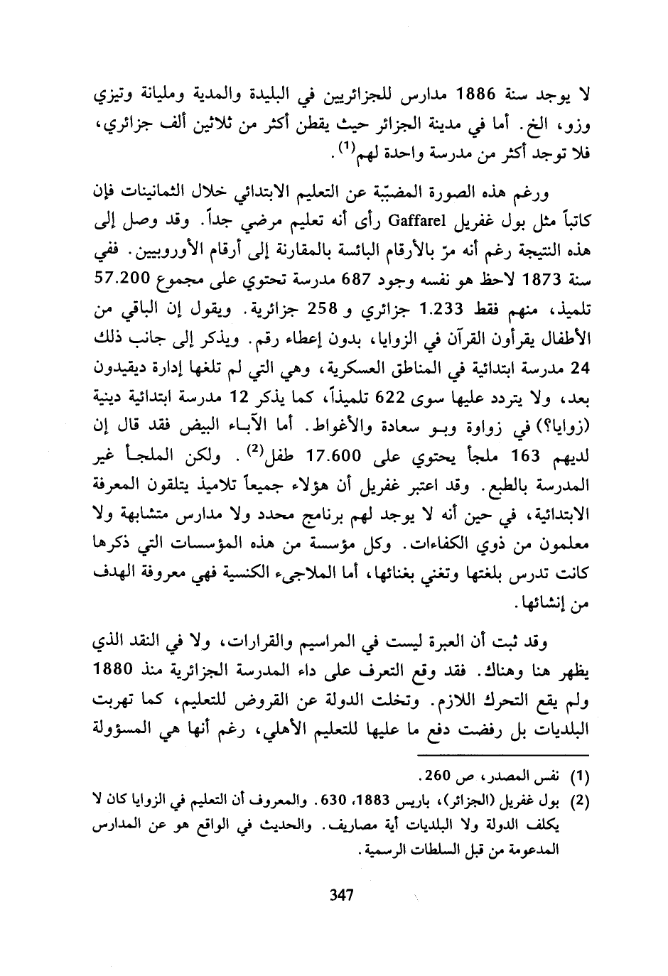ورغم هذه الصورة المضببة عن التعليم الابتدائي خلال الثمانينات فإن كاتبا مثل بول غفريل Gaffarel رأى أنه تعليم مرضي جدا. وقد وصل إلى هذه النتيجة رغم أنه مر بالأرقام البائسة بالمقارنة إلى أرقام الأوروبيين. ففي سنة 1873 لاحظ هو نفسه وجود 687 مدرسة تحتوي على مجموع 57، 200 تلميذ، منهم فقط 1، 233 جزائري و 258 جزائرية. ويقول إن الباقي من الأطفال يقرأون القرآن في الزوايا، بدون إعطاء رقم. ويذكر إلى جانب ذلك 24 مدرسة ابتدائية في المناطق العسكرية، وهي التي لم تلغها إدارة ديقيدون بعد، ولا يتردد عليها سوى 622 تلميذا، كما يذكر 12 مدرسة ابتدائية دينية (زوايا؟) في زواوة وبو سعادة والأغواط. أما الآباء البيض فقد قال إن لديهم 163 ملجا يحتوي على 17.600 طفل (¬2). ولكن الملجأ غير المدرسة بالطبع. وقد اعتبر غفريل أن هؤلاء جميعا تلاميذ يتلقون المعرفة الابتدائية، في حين أنه لا يوجد لهم برنامج محدد ولا مدارس متشابهة ولا معلمون من ذوي الكفاءات. وكل مؤسسة من هذه المؤسسات التي ذكرها كانت تدرس بلغتها وتغني بغنائها، أما الملاجئ الكنسية فهي معروفة الهدف من إنشائها.
