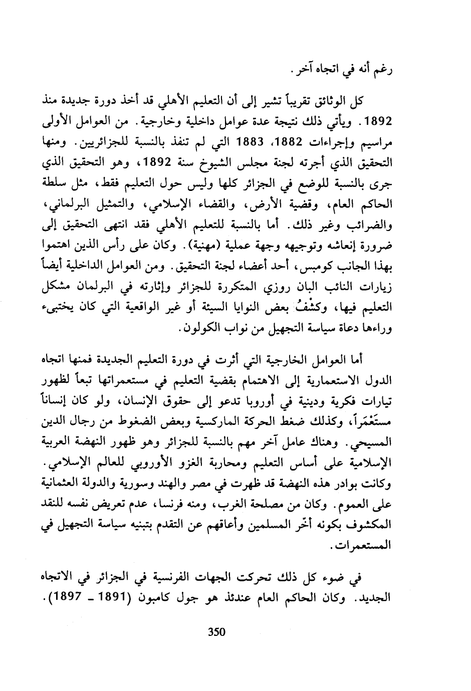 كل الوثائق تقريبا تشير إلى أن التعليم الأهلي قد أخذ دورة جديدة منذ 1892. ويأتي ذلك نتيجة عدة عوامل داخلية وخارجية. من العوامل الأولى مراسيم وإجراءات 1882، 1883 التي لم تنفذ بالنسبة للجزائريين. ومنها التحقيق الذي أجرته لجنة مجلس الشيوخ سنة 1892، وهو التحقيق الذي جرى بالنسبة للوضع في الجزائر كلها وليس حول التعليم فقط، مثل سلطة الحاكم العام، وقضية الأرض، والقضاء الإسلامي، والتمثيل البرلماني، والضرائب وغير ذلك. أما بالنسبة للتعليم الأهلي فقد انتهى التحقيق إلى ضرورة إنعاشه وتوجيهه وجهة عملية (مهنية). وكان على رأس الذين اهتموا بهذا الجانب كومبس، أحد أعضاء لجنة التحقيق. ومن العوامل الداخلية أيضا زيارات النائب البان روزي المتكررة للجزائر وإثارته في البرلمان مشكل التعليم فيها، وكشف بعض النوايا السيئة أو غير الواقعية التي كان يختبئ وراءها دعاة سياسة التجهيل من نواب الكولون.