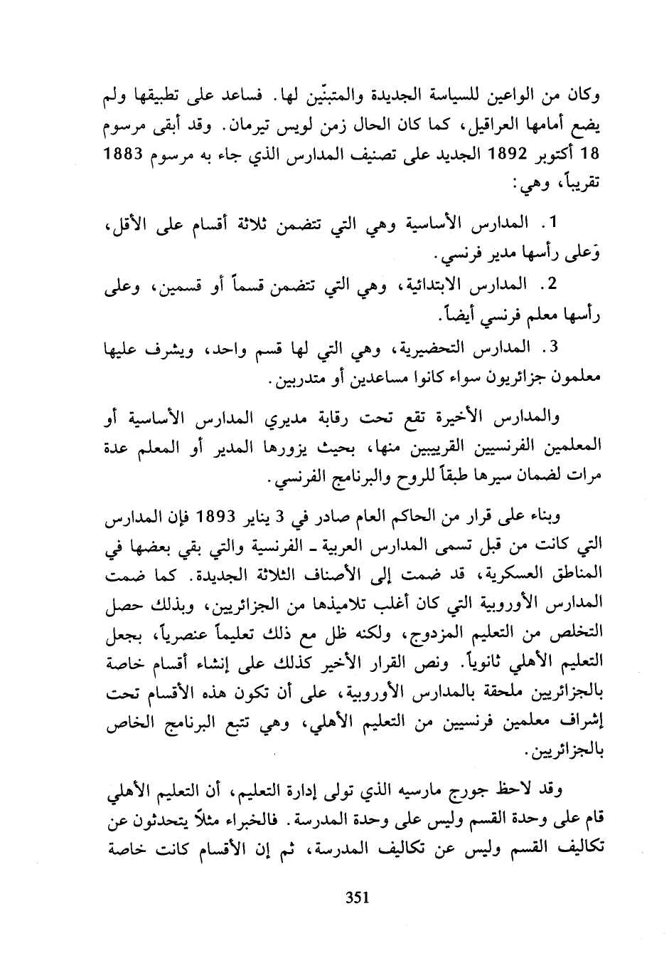 وبناء على قرار من الحاكم العام صادر في 3 يناير 1893 فإن المدارس التي كانت من قبل تسمى المدارس العربية - الفرنسية والتي بقي بعضها في المناطق العسكرية، قد ضمت إلى الأصناف الثلاثة الجديدة. كما ضمت المدارس الأوروبية التي كان أغلب تلاميذها من الجزائريين، وبذلك حصل التخلص من التعليم المزدوج، ولكنه ظل مع ذلك تعليما عنصريا، بجعل التعليم الأهلي ثانويا. ونص القرار الأخير كذلك على إنشاء أقسام خاصة بالجزائريين ملحقة بالمدارس الأوروبية، على أن تكون هذه الأقسام تحت إشراف معلمين فرنسيين من التعليم الأهلي، وهي تتبع البرنامج الخاص بالجزائريين.