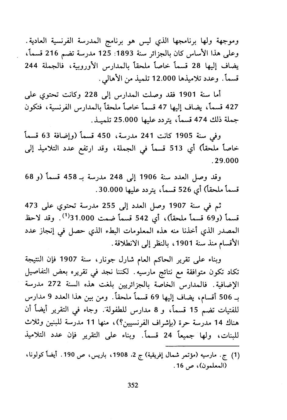 وموجهة ولها برنامجها الذي ليس هو برنامج المدرسة الفرنسية العادية. وعلى هذا الأساس كان بالجزائر سنة 1893: 125 مدرسة تضم 216 قسما، يضاف إليها 28 قسما خاصا ملحقا بالمدارس الأوروبية، فالجملة 244 قسما. وعدد تلاميذها 12.000 تلميذ من الأهالي.