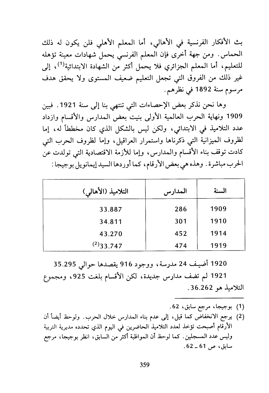 وها نحن نذكر بعض الإحصاءات التي تنتهي بنا إلى سنة 1921. فبين 1959 ونهاية الحرب العالمية الأولى بنيت بعض المدارس والأقسام وازداد عدد التلاميذ في الابتدائي، ولكن ليس بالشكل الذي كان مخططا له، إما لظروف الميزانية التي ذكرناها واستمرار العراقيل، وإما لظروف الحرب التي كادت توقف بناء الأقسام والمدارس، وإما للأزمة الاقتصادية التي تولدت عن الحرب مباشرة. وهذه هي بعض الأرقام، كما أوردها السيد إيمانويل بوجيجا:
