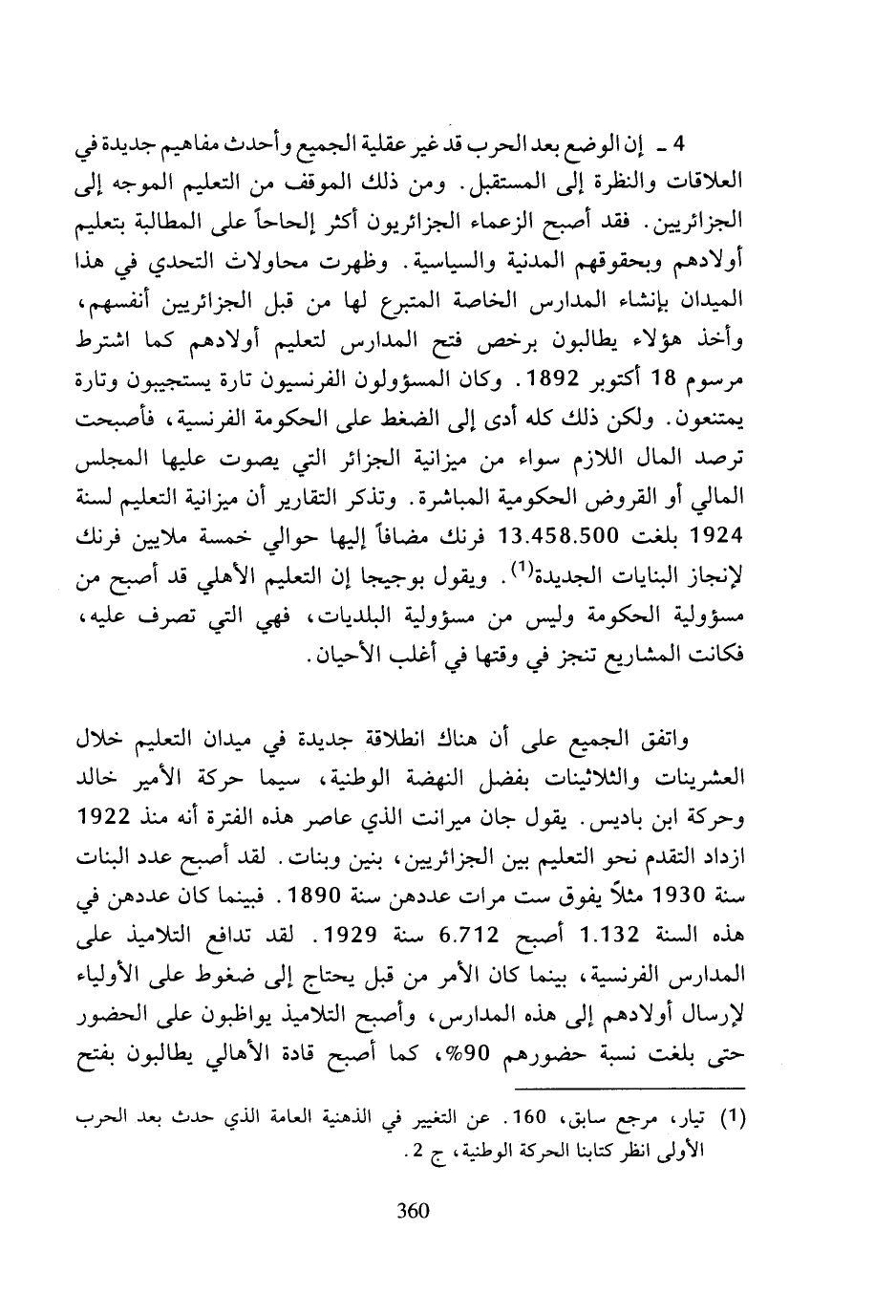 4 - إن الوضع بعد الحرب قد غير عقلية الجميع وأحدث مفاهيم جديدة في العلاقات والنظرة إلى المستقبل. ومن ذلك الموقف من التعليم الموجه إلى الجزائريين. فقد أصبح الزعماء الجزائريون أكثر إلحاحا على المطالبة بتعليم أولادهم وبحقوقهم المدنية والسياسية. وظهرت محاولات التحدي في هذا الميدان بإنشاء المدارس الخاصة المتبرع لها من قبل الجزائريين أنفسهم، وأخذ هؤلاء يطالبون برخص فتح المدارس لتعليم أولادهم كما اشترط مرسوم 18 أكتوبر 1892. وكان المسؤولون الفرنسيون تارة يستجيبون وتارة يمتنعون. ولكن ذلك كله أدى إلى الضغط على الحكومة الفرنسية، فأصبحت ترصد المال اللازم سواء من ميزانية الجزائر التي يصوت عليها المجلس المالي أو القروض الحكومية المباشرة. وتذكر التقارير أن ميزانية التعليم لسنة 1924 بلغت 13.458.500 فرنك مضافا إليها حوالي خمسة ملايين فرنك لإنجاز البنايات الجديدة (¬1). ويقول بوجيجا إن التعليم الأهلي قد أصبح من مسؤولية الحكومة وليس من مسؤولية البلديات، فهي التي تصرف عليه، فكانت المشاريع تنجز في وقتها في أغلب الأحيان.