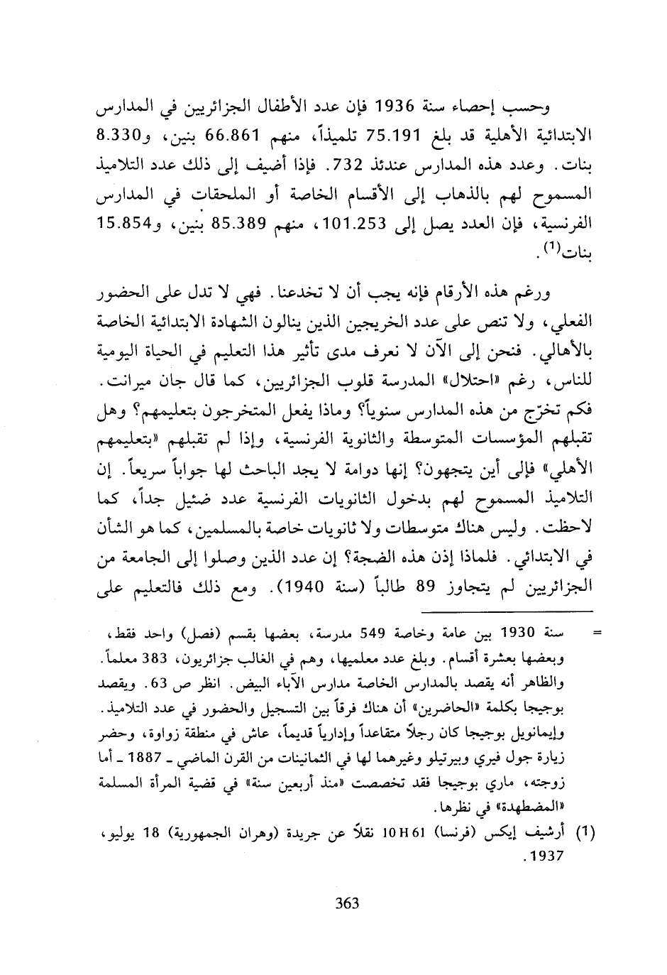 وحسب إحصاء سنة 1936 فإن عدد الأطفال الجزائريين في المدارس الابتدائية الأهلية قد بلغ 75.191 تلميذا، منهم 66.861 بنين، و 8.330 بنات. وعدد هذه المدارس عندئذ 732. فإذا أضيف إلى ذلك عدد التلاميذ المسموح لهم بالذهاب إلى الأقسام الخاصة أو الملحقات في المدارس الفرنسية، فإن العدد يصل إلى 101، 253، منهم 85.389 بنين، و 15.854 بنات (¬1).