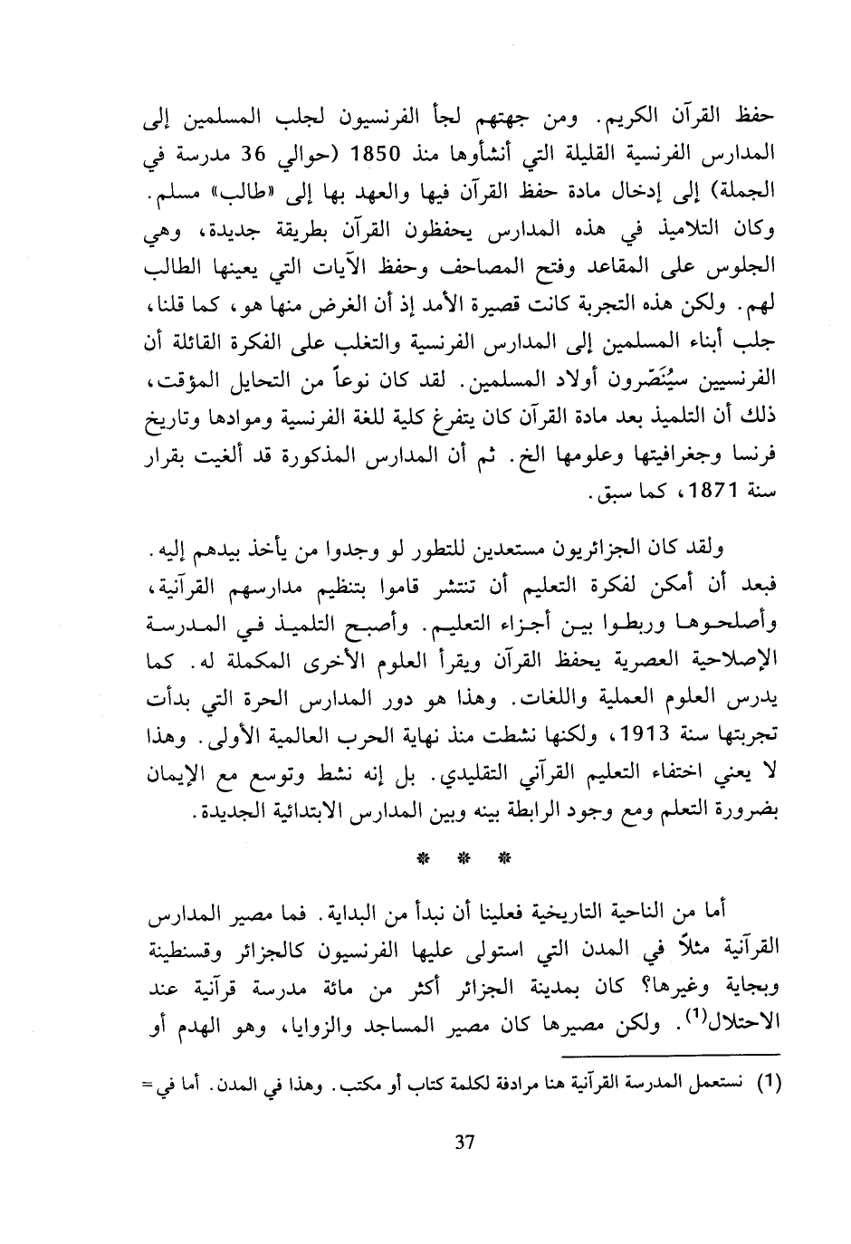 أما من الناحية التاريخية فعلينا أن نبدأ من البداية. فما مصير المدارس القرآنية مثلا في المدن التي استولى عليها الفرنسيون كالجزائر وقسنطينة وبجاية وغيرها؟ كان بمدينة الجزائر أكثر من مائة مدرسة قرآنية عند الاحتلال (¬1). ولكن مصيرها كان مصير المساجد والزوايا، وهو الهدم أو