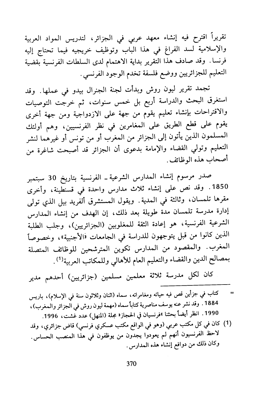 (¬1) كان في كل مكتب عربي (وهو في الواقع مكتب عسكري فرنسي) قاض جزائري، وقد لاحظ الفرنسيون أنهم لم يعودوا يجدون من يوظفون في هذا المنصب الحساس. وكان ذلك من دوافع إنشاء هذه المدارس.