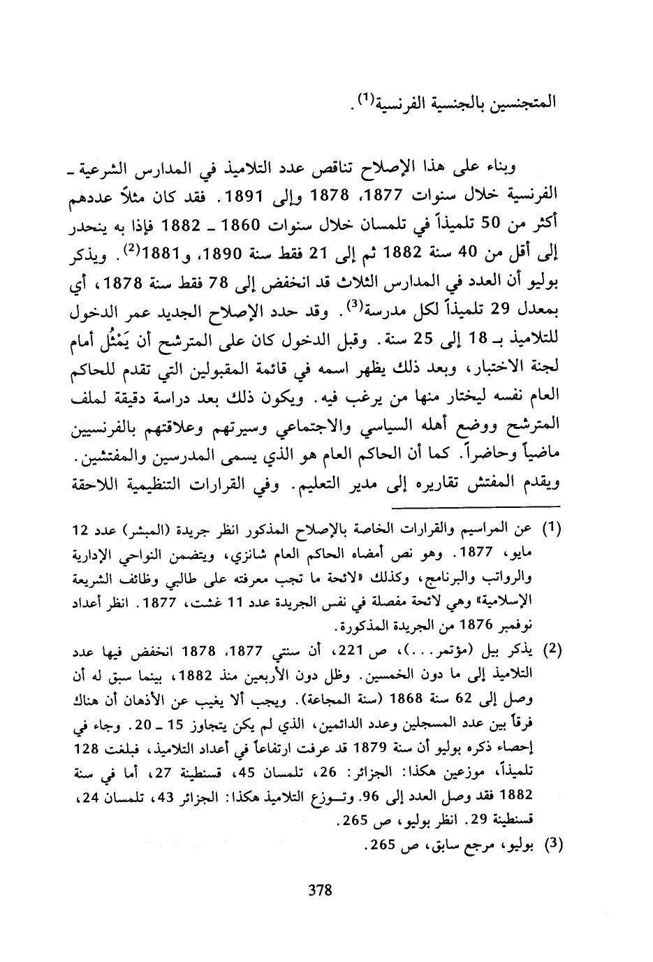 (¬2) يذكر بيل (مؤتمر ...)، ص 221، أن سنتي 1877، 1878 انخفض فيها عدد التلاميذ إلى ما دون الخمسين. وظل دون الأربعين منذ 1882، بينما سبق له أن وصل إلى 62 سنة 1868 (سنة المجاعة). ويجب ألا يغيب عن الأذهان أن هناك فرقا بين عدد المسجلين وعدد الدائمين، الذي لم يكن يتجاوز 15 - 20. وجاء في إحصاء ذكره بوليو أن سنة 1879 قد عرفت ارتفاعا في أعداد التلاميذ، فبلغت 128 تلميذا، موزعين هكذا: الجزائر: 26، تلمسان 45، قسنطينة 27، أما في سنة 1882 فقد وصل العدد إلى 96. وتوزع التلاميذ هكذا: الجزائر 43، تلمسان 24، قسنطينة 29. انظر بوليو، ص 265.