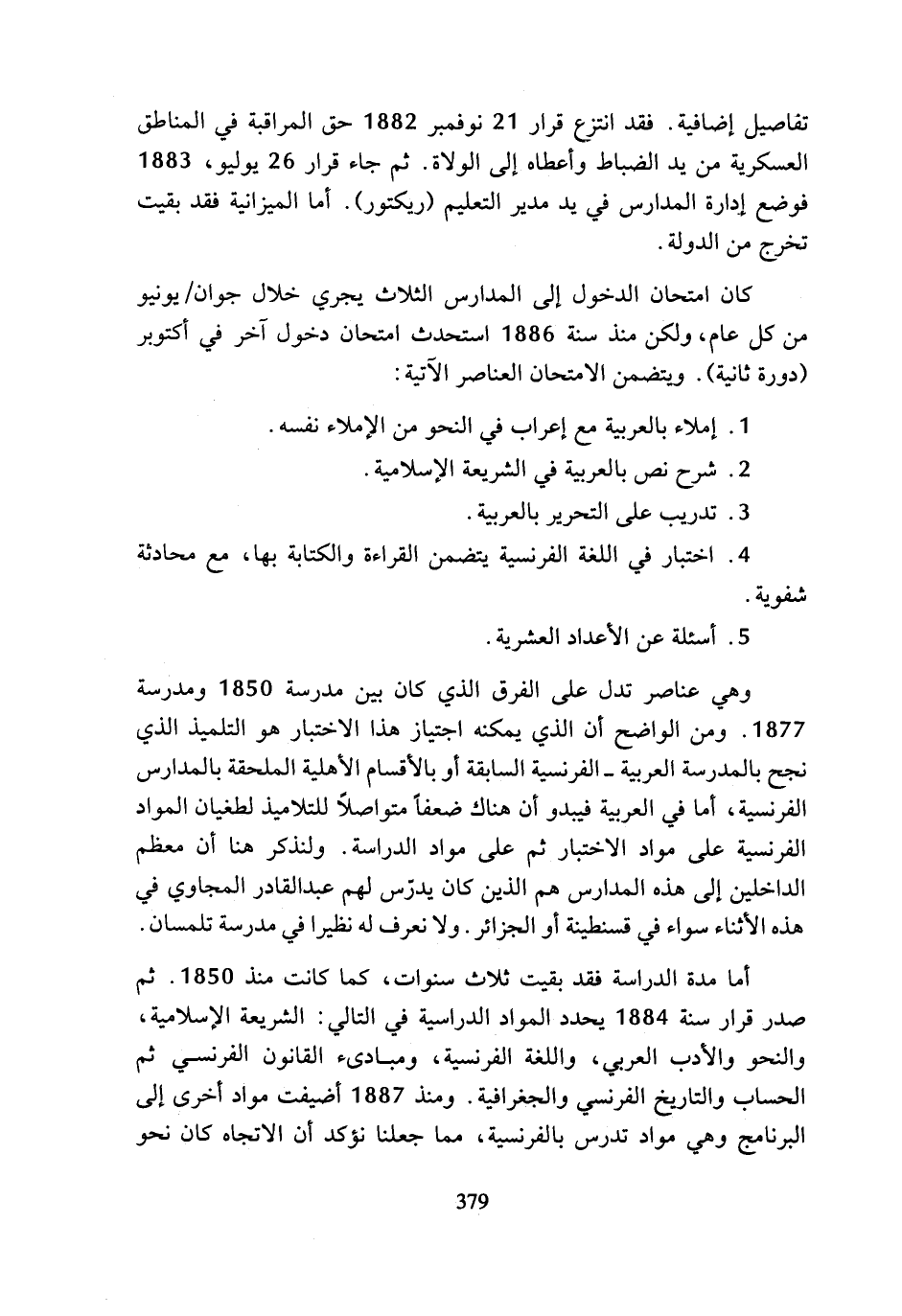 وهي عناصر تدل على الفرق الذي كان بين مدرسة 1850 ومدرسة 1877. ومن الواضح أن الذي يمكنه اجتياز هذا الاختبار هو التلميذ الذي نجح بالمدرسة العربية - الفرنسية السابقة أو بالأقسام الأهلية الملحقة بالمدارس الفرنسية، أما في العربية فيبدو أن هناك ضعفا متواصلا للتلاميذ لطغيان المواد الفرنسية على مواد الاختبار ثم على مواد الدراسة. ولنذكر هنا أن معظم الداخلين إلى هذه المدارس هم الذين كان يدرس لهم عبد القادر المجاوي في هذه الأثناء سواء في قسنطينة أو الجزائر. ولا نعرف له نظيرا في مدرسة تلمسان. أما مدة الدراسة فقد بقيت ثلاث سنوات، كما كانت منذ 1850. ثم صدر قرار سنة 1884 يحدد المواد الدراسية في التالي: الشريعة الإسلامية، والنحو والأدب العربي، واللغة الفرنسية، ومبادئ القانون الفرنسي ثم الحساب والتاريخ الفرنسي والجغرافية. ومنذ 1887 أضيفت مواد أخرى إلى البرنامج وهي مواد تدرس بالفرنسية، مما جعلنا نؤكد أن الاتجاه كان نحو