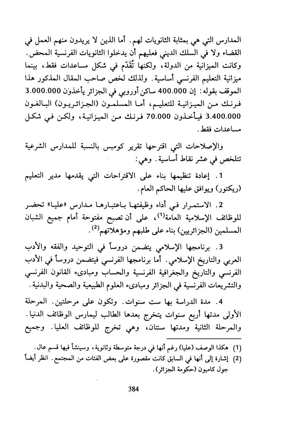 المدارس التي هي بمثابة الثانويات لهم. أما الذين لا يريدون منهم العمل في القضاء ولا في السلك الديني فعليهم أن يدخلوا الثانويات الفرنسية المحض. وكانت الميزانية من الدولة، ولكنها تقدم في شكل مساعدات فقط، بينما ميزانية التعليم الفرنسي أساسية. ولذلك لخص صاحب المقال المذكور هذا الموقف بقوله: إن 400.000 ساكن أوروبي في الجزائر يأخذؤن 3.000.000 فرنك من الميزانية للتعليم، أما المسلمون (الجزائريون) البالغون 3.400.000 فيأخذون 70.000 فرنك من الميزانية، ولكن في شكل مساعدات فقط.