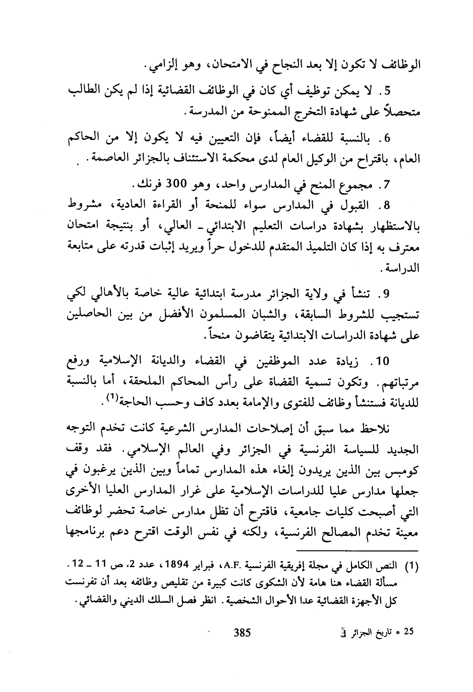 (¬1) النص الكامل في مجلة إفريقية الفرنسية A.F.، فبراير 1894، عدد 2، ص 11 - 12. مسألة القضاء هنا هامة لأن الشكوى كانت كبيرة من تقليص وظائفه بعد أن تفرنست كل الأجهزة القضائية عدا الأحوال الشخصية. انظر فصل السلك الديني والقضائي.