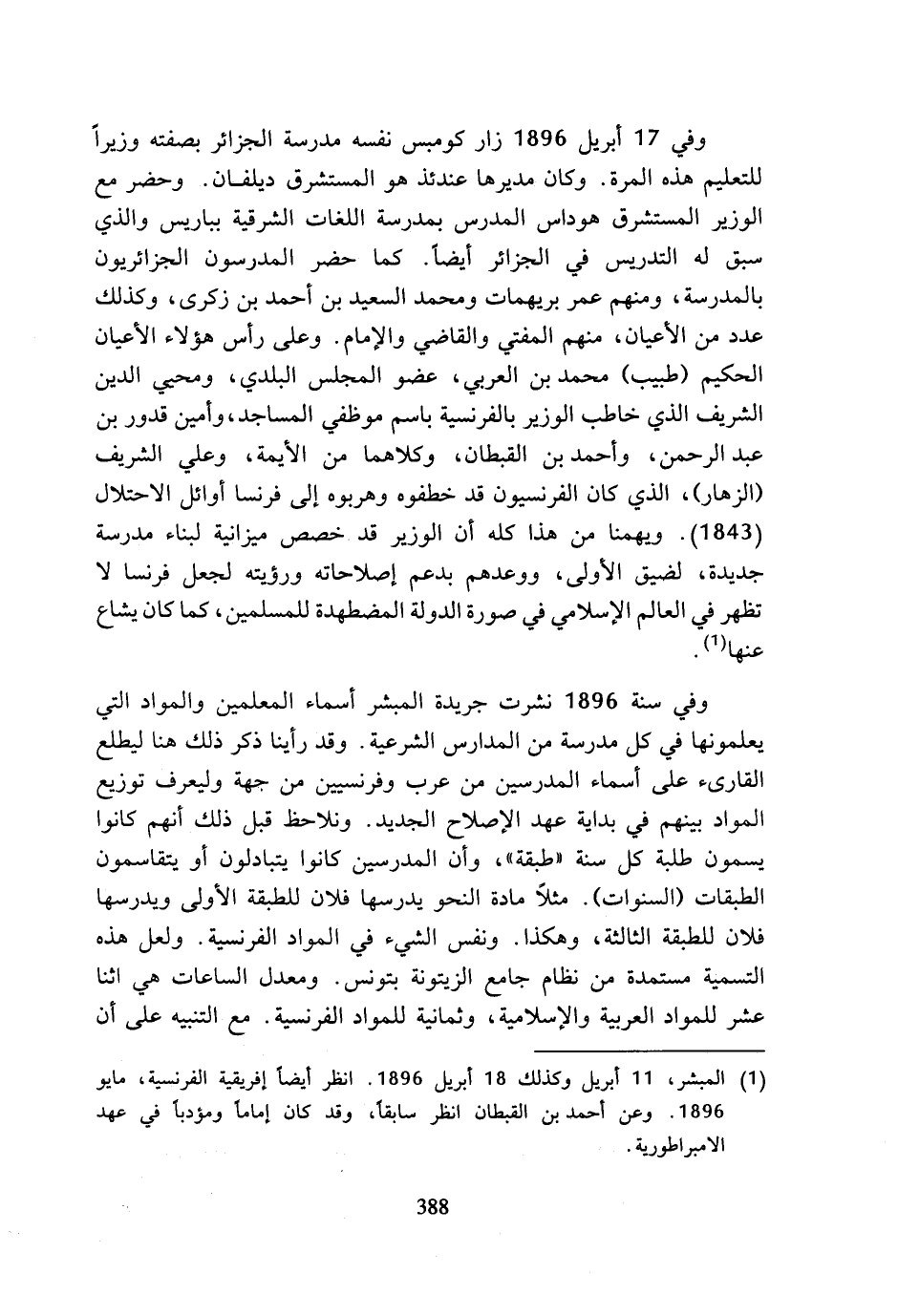 (¬1) المبشر، 11 أبريل وكذلك 18 أبريل 1896. انظر أيضا إفريقية الفرنسية، مايو 1896. وعن أحمد بن القبطان انظر سابقا، وقد كان إماما ومؤدبا في عهد الامبراطورية.