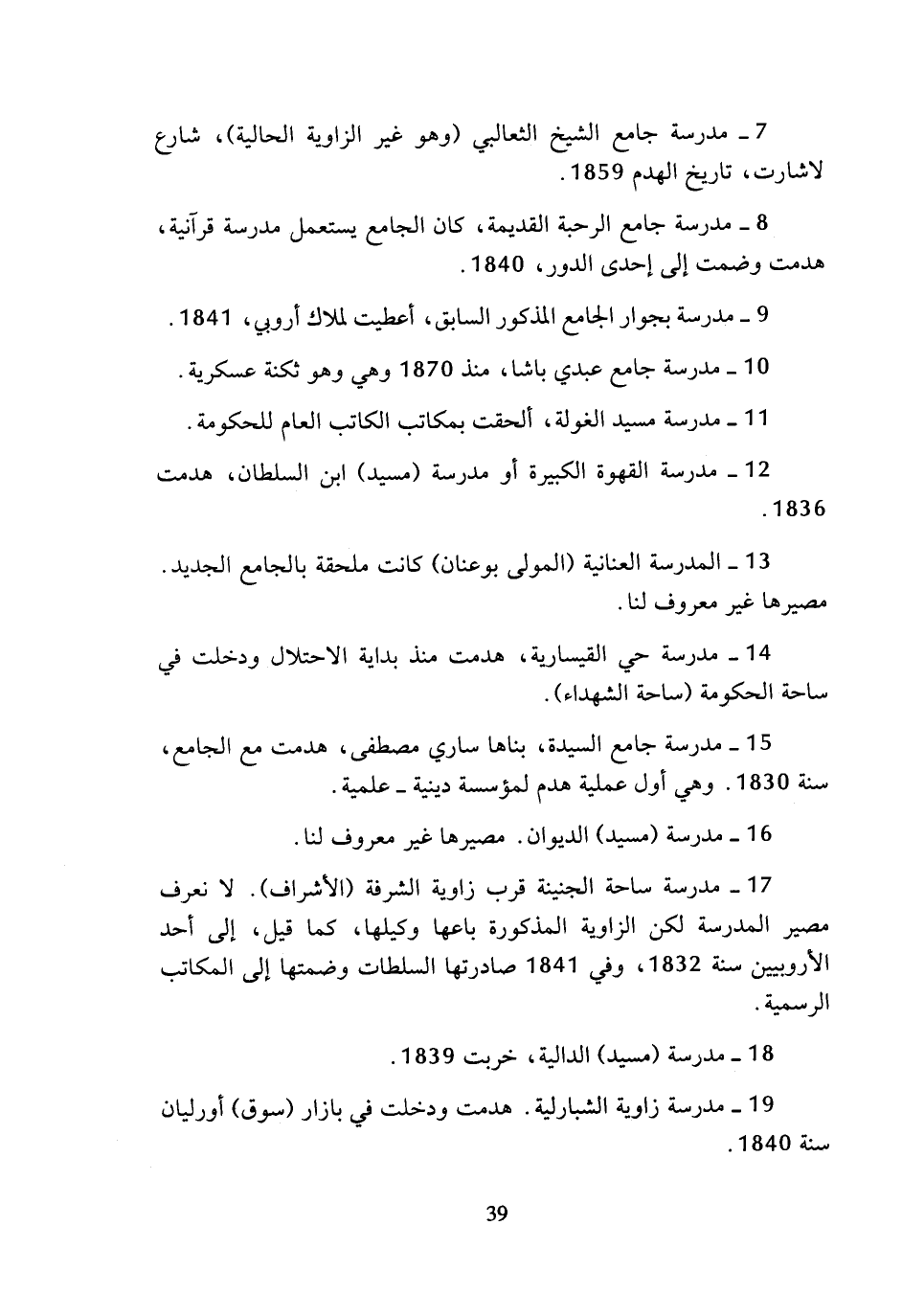 15 - مدرسة جامع السيدة، بناها ساري مصطفى، هدمت مع الجامع، سنة 1830. وهي أول عملية هدم لمؤسسة دينية - علمية.