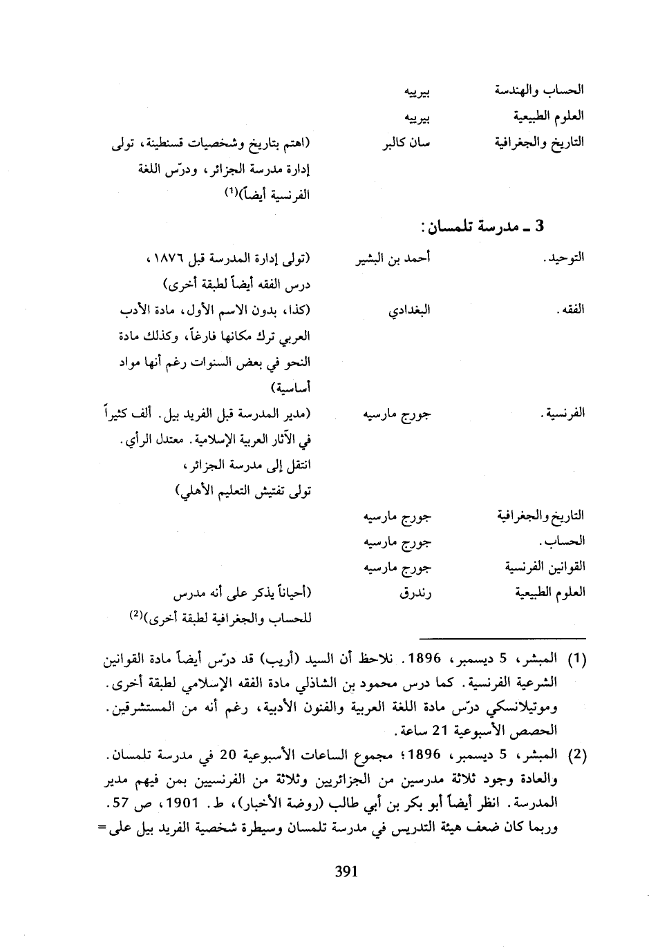 (¬2) المبشر، 5 ديسبر، 1896؛ مجموع الساعات الأسبوعية 20 في مدرسة تلمسان. والعادة وجود ثلاثة مدرسين من الجزائريين وثلاثة من الفرنسيين بمن فيهم مدير المدرسة. انظر أيضا أبو بكر بن أبي طالب (روضة الأخبار)، ط. 1901، ص 57. وربما كان ضعف هيئة التدريس في مدرسة تلمسان وسيطرة شخصية الفريد بيل على =