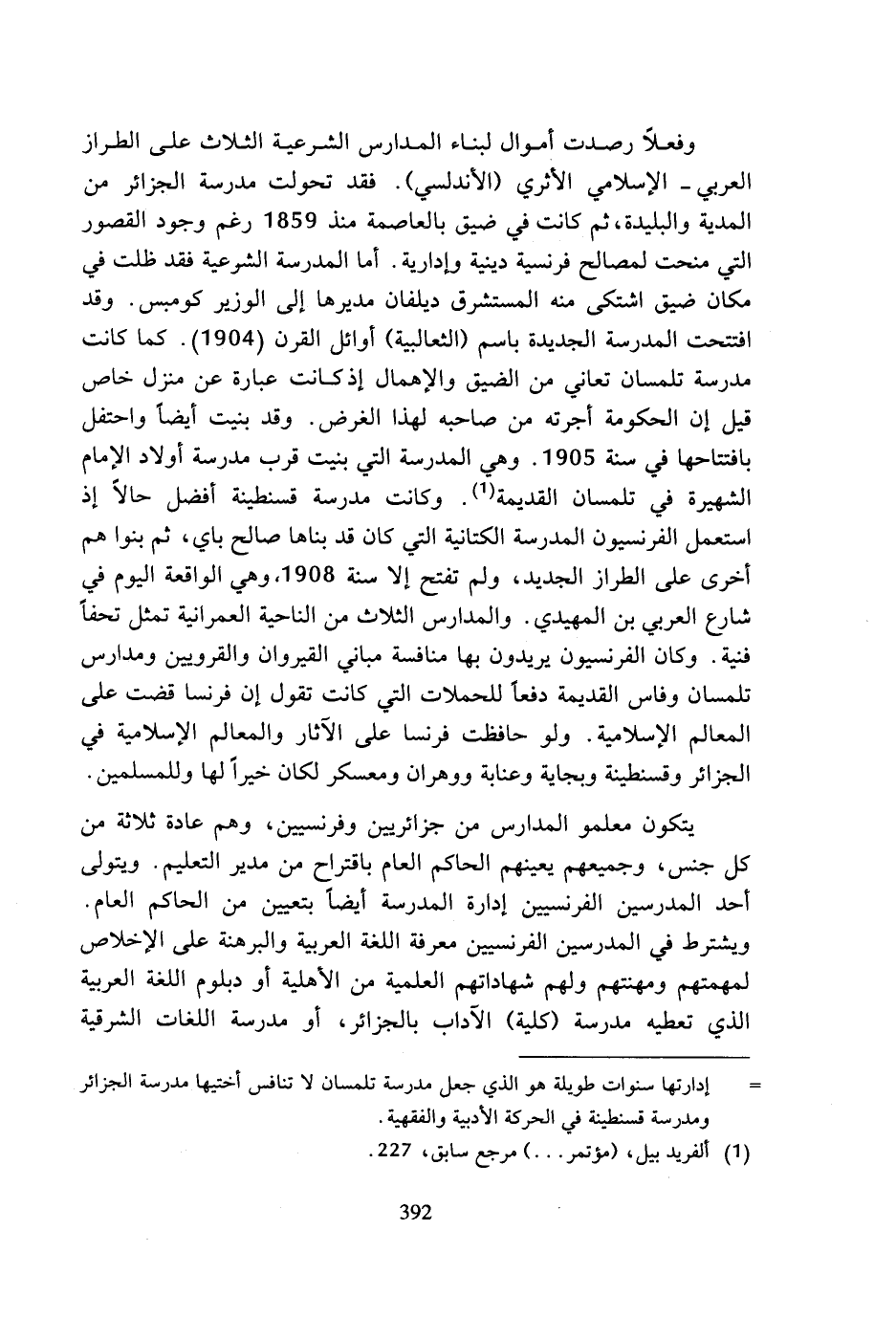 وفعلا رصدت أموال لبناء المدارس الشرعية الثلاث على الطراز العربي - الإسلامي الأثري (الأندلسي). فقد تحولت مدرسة الجزائر من المدية والبليدة، ثم كانت في ضيق بالعاصمة منذ 1859 رغم وجود القصور التي منحت لمصالح فرنسية دينية وإدارية. أما المدرسة الشرعية فقد ظلت في مكان ضيق اشتكى منه المستشرق ديلفان مديرها إلى الوزير كومبس. وقد افتتحت المدرسة الجديدة باسم (الثعالبية) أوائل القرن (1904). كما كانت مدرسة تلمسان تعاني من الضيق والإهمال إذ كانت عبارة عن منزل خاص قيل إن الحكومة أجرته من صاحبه لهذا الغرض. وقد بنيت أيضا واحتفل بافتتاحها في سنة 1905. وهي المدرسة التي بنيت قرب مدرسة أولاد الإمام الشهيرة في تلمسان القديمة (¬1). وكانت مدرسة قسنطينة أفضل حالا إذ استعمل الفرنسيون المدرسة الكتانية التي كان قد بناها صالح باي، ثم بنوا هم أخرى على الطراز الجديد، ولم تفتح إلا سنة 1908، وهي الواقعة اليوم في شارع العربي بن المهيدي. والمدارس الثلاث من الناحية العمرانية تمثل تحفا فنية. وكان الفرنسيون يريدون بها منافسة مباني القيروان والقرويين ومدارس تلمسان وفاس القديمة دفعا للحملات التي كانت تقول إن فرنسا قضت على المعالم الإسلامية. ولو حافظت فرنسا على الآثار والمعالم الإسلامية في الجزائر وقسنطينة وبجاية وعنابة ووهران ومعسكر لكان خيرا لها وللمسلمين. يتكون معلمو المدارس من جزائريين وفرنسيين، وهم عادة ثلاثة من كل جنس، وجميعهم يعينهم الحاكم العام باقتراح من مدير التعليم. ويتولى أحد المدرسين الفرنسيين إدارة المدرسة أيضا بتعيين من الحاكم العام. ويشترط في المدرسين الفرنسيين معرفة اللغة العربية والبرهنة على الإخلاص لمهمتهم ومهنتهم ولهم شهاداتهم العلمية من الأهلية أو دبلوم اللغة العربية الذي تعطيه مدرسة (كلية) الآداب بالجزائر، أو مدرسة اللغات الشرقية