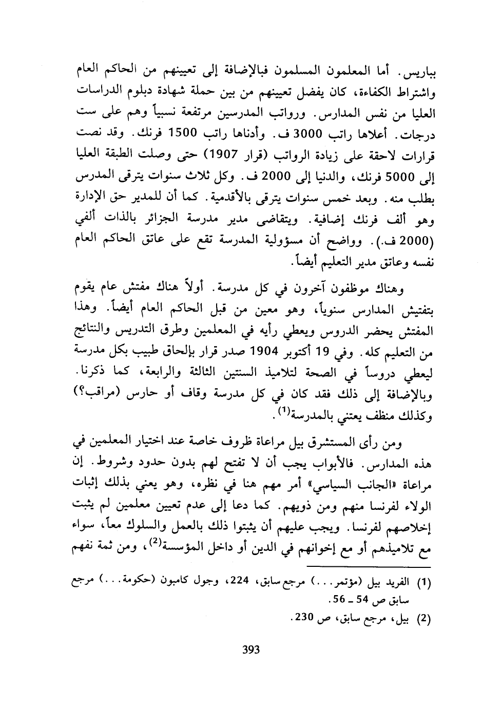 بباريس. أما المعلمون المسلمون فبالإضافة إلى تعيينهم من الحاكم العام واشتراط الكفاءة، كان يفضل تعيينهم من بين حملة شهادة دبلوم الدراسات العليا من نفس المدارس. ورواتب المدرسين مرتفعة نسبيا وهم على ست درجات. أعلاها راتب 3000 ف. وأدناها راتب 1500 فرنك. وقد نصت قرارات لاحقة على زيادة الرواتب (قرار 1907) حتى وصلت الطبقة العليا إلى 5000 فرنك، والدنيا إلى 2000 ف. وكل ثلاث سنوات يترقى المدرس بطلب منه. وبعد خمس سنوات يترقى بالأقدمية. كما أن للمدير حق الإدارة وهو ألف فرنك إضافية. ويتقاضى مدير مدرسة الجزائر بالذات ألفي (2000 ف.). وواضح أن مسؤولية المدرسة تقع على عاتق الحاكم العام نفسه وعاتق مدير التعليم أيضا.