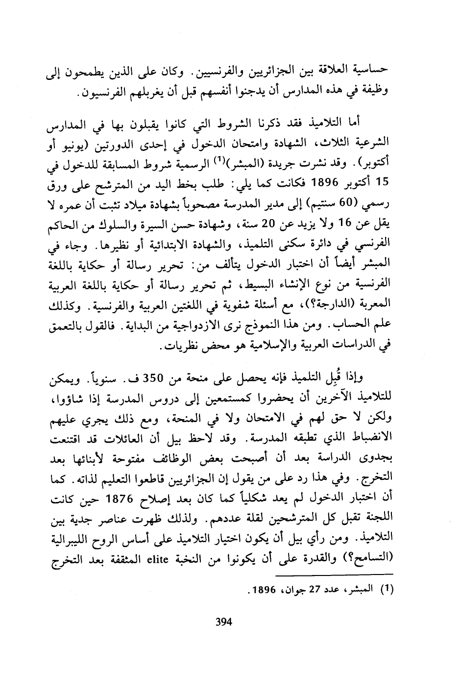 حساسية العلاقة بين الجزائريين والفرنسيين. وكان على الذين يطمحون إلى وظيفة في هذه المدارس أن يدجنوا أنفسهم قبل أن يغربلهم الفرنسيون.