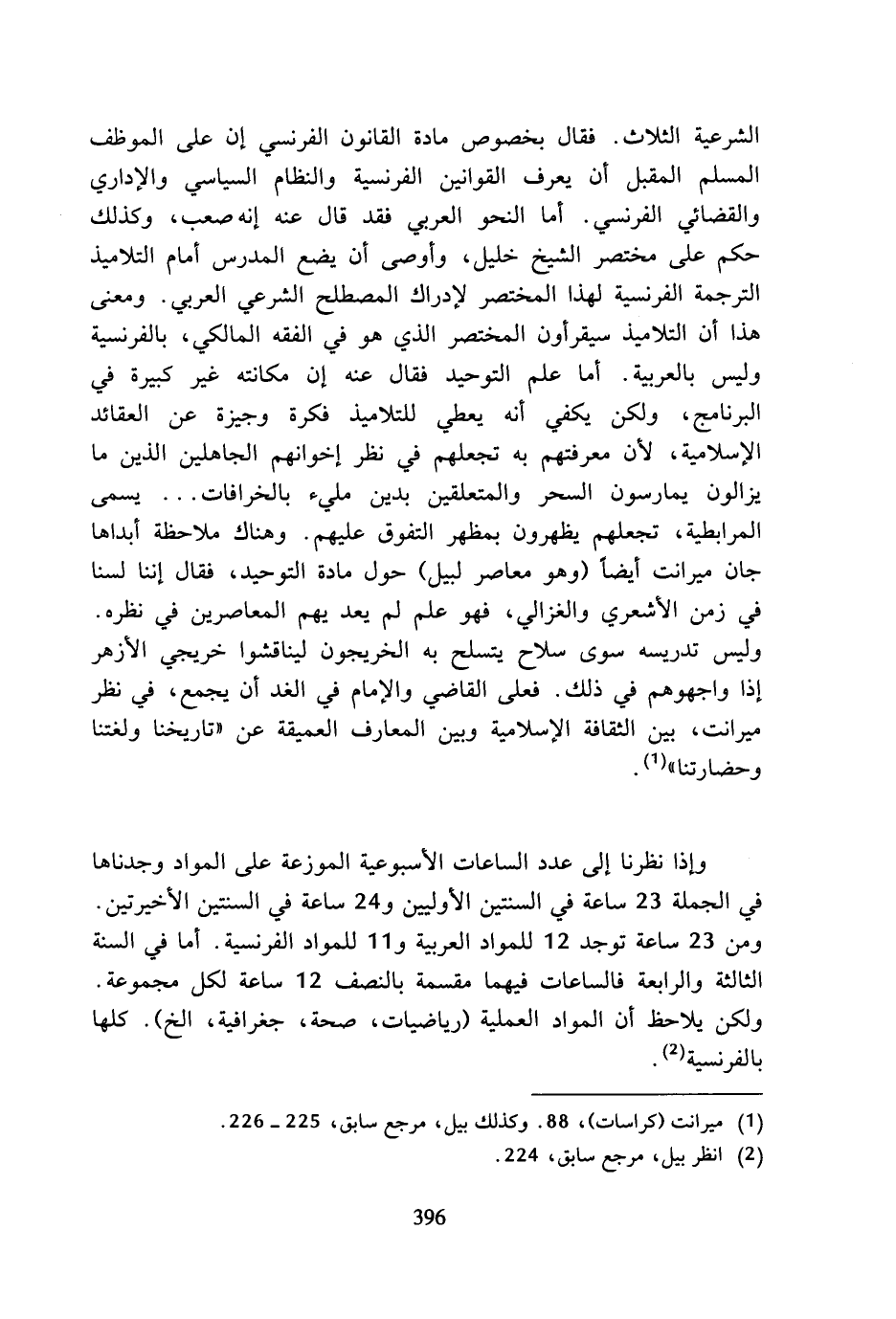 الشرعية الثلاث. فقال بخصوص مادة القانون الفرنسي إن على الموظف المسلم المقبل أن يعرف القوانين الفرنسية والنظام السياسي والإداري والقضائي الفرنسي. أما النحو العربي فقد قال عنه إنه صعب، وكذلك حكم على مختصر الشيخ خليل، وأوصى أن يضع المدرس أمام التلاميذ الترجمة الفرنسية لهذا المختصر لإدراك المصطلح الشرعي العربي. ومعنى هذا أن التلاميذ سيقرأون المختصر الذي هو في الفقه المالكي، بالفرنسية وليس بالعربية. أما علم التوحيد فقال عنه إن مكانته غير كبيرة في البرنامج، ولكن يكفي أنه يعطي للتلاميذ فكرة وجيزة عن العقائد الإسلامية، لأن معرفتهم به تجعلهم في نظر إخوانهم الجاهلين الذين ما يزالون يمارسون السحر والمتعلقين بدين مليء بالخرافات ... يسمى المرابطية، تجعلهم يظهرون بمظهر التفوق عليهم. وهناك ملاحظة أبداها جان ميرانت أيضا (وهو معاصر لبيل) حول مادة التوحيد، فقال إننا لسنا في زمن الأشعري والغزالي، فهو علم لم يعد يهم المعاصرين في نظره. وليس تدريسه سوى سلاح يتسلح به الخريجون ليناقشوا خريجي الأزهر إذا واجهوهم في ذلك. فعلى القاضي والإمام في الغد أن يجمع، في نظر ميرانت، بين الثقافة الإسلامية وبين المعارف العميقة عن (تاريخنا ولغتنا وحضارتنا) (¬1).
