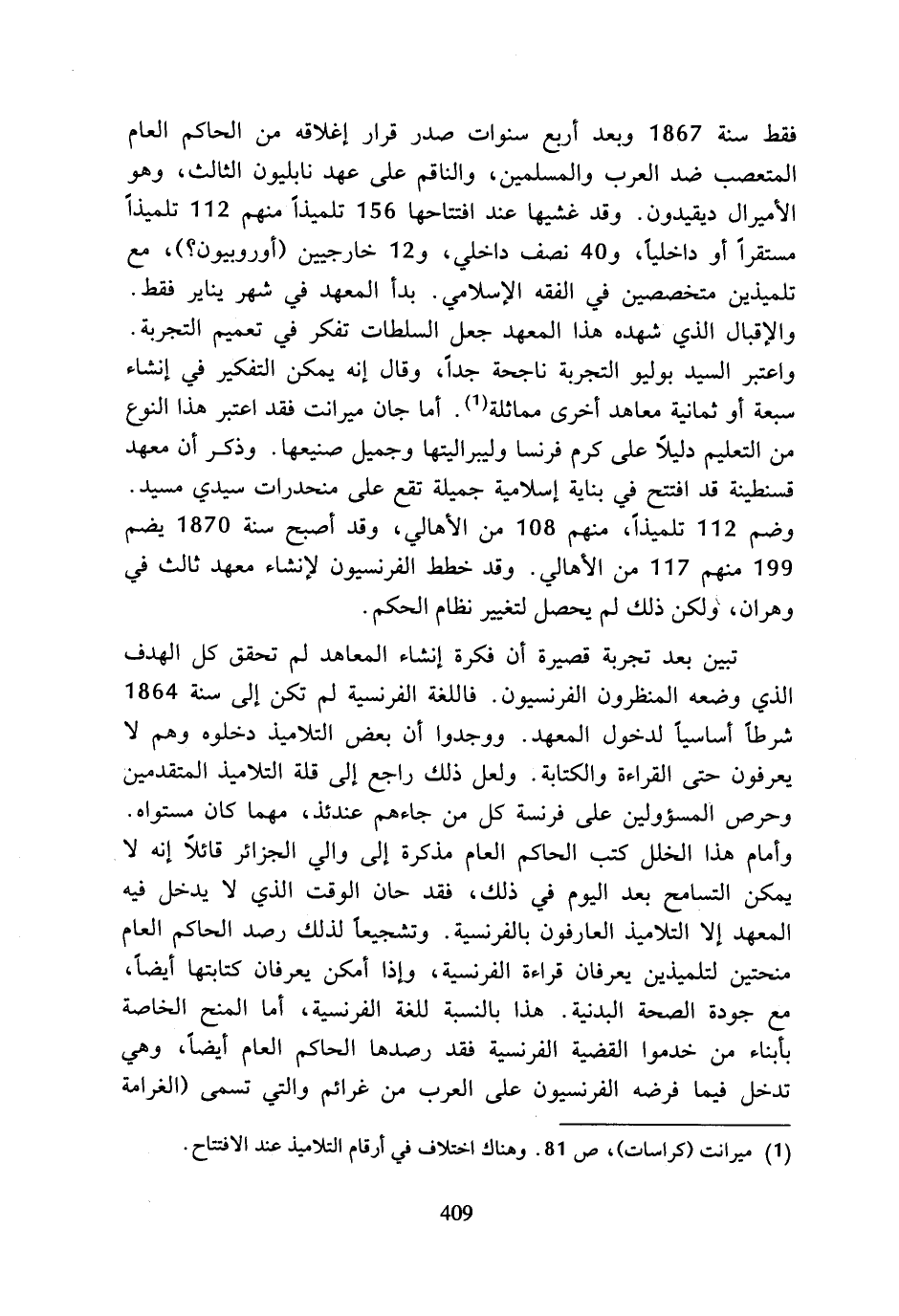 فقط سنة 1867 وبعد أربع سنوات صدر قرار إغلاقه من الحاكم العام المتعصب ضد العرب والمسلمين، والناقم على عهد نابليون الثالث، وهو الأميرال ديقيدون. وقد غشيها عند افتتاحها 156 تلميذا منهم 112 تلميذا مستقرا أو داخليا، و 40 نصف داخلي، و 12 خارجيين (أوروبيون؟)، مع تلميذين متخصصين في الفقه الإسلامي. بدأ المعهد في شهر يناير فقط. والإقبال الذي شهده هذا المعهد جعل السلطات تفكر في تعميم التجربة. واعتبر السيد بوليو التجربة ناجحة جدا، وقال إنه يمكن التفكير في إنشاء سبعة أو ثمانية معاهد أخرى مماثلة (¬1). أما جان ميرانت فقد اعتبر هذا النوع من التعليم دليلا على كرم فرنسا وليبراليتها وجميل صنيعها. وذكر أن معهد قسنطينة قد افتتح في بناية إسلامية جميلة تقع على منحدرات سيدي مسيد. وضم 112 تلميذا، منهم 108 من الأهالي، وقد أصبح سنة 1870 يضم 199 منهم 117 من الأهالي. وقد خطط الفرنسيون لإنشاء معهد ثالث في وهران، ولكن ذلك لم يحصل لتغيير نظام الحكم.