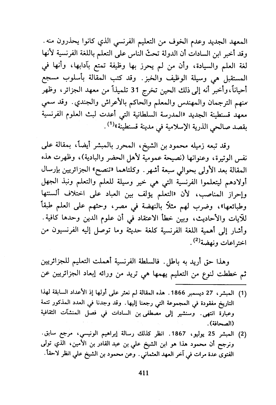 المعهد الجديد وعدم الخوف من التعليم الفرنسي الذي كانوا يحذرون منه. وقد أخبر ابن السادات أن الدولة تحث الناس على التعلم باللغة الفرنسية لأنها لغة العلم والسيادة، وأن من لم يحرز بها وظيفة تمتع بآدابها، وأنها في المستقبل هي وسيلة الوظيف والخبز. وقد كتب المقالة بأسلوب مسجع أحيانا، وأخبر أنه إلى ذلك الحين تخرج 31 تلميذا من معهد الجزائر، وظهر منهم الترجمان والمهندس والمعلم والحاكم بالأعراش والجندي. وقد سمي معهد قسنطينة الجديد (المدرسة السلطانية التي أعدت لبث العلوم الفرنسية بقصد صالحي الذرية الإسلامية في مدينة قسنطينة) (¬1).