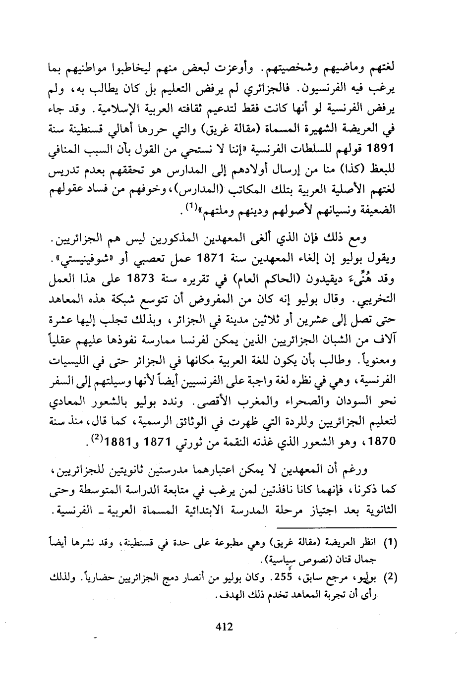 (¬2) بوليو، مرجع سابق، 255. وكان بوليو من أنصار دمج الجزائريين حضاريا. ولذلك رأى أن تجربة المعاهد تخدم ذلك الهدف.