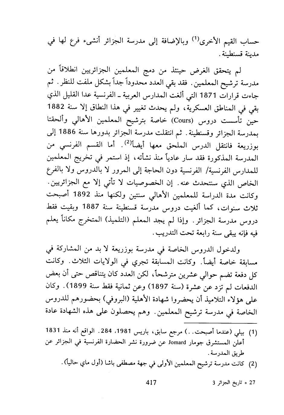 (¬1) بيلي (عندما أصبحت ..) مرجع سابق، باريس 1981، 284. الواقع أنه منذ 1831 أعلن المستشرق جومار jomard عن ضرورة نشر الحضارة الفرنسية في الجزائر عن طريق المدرسة.
